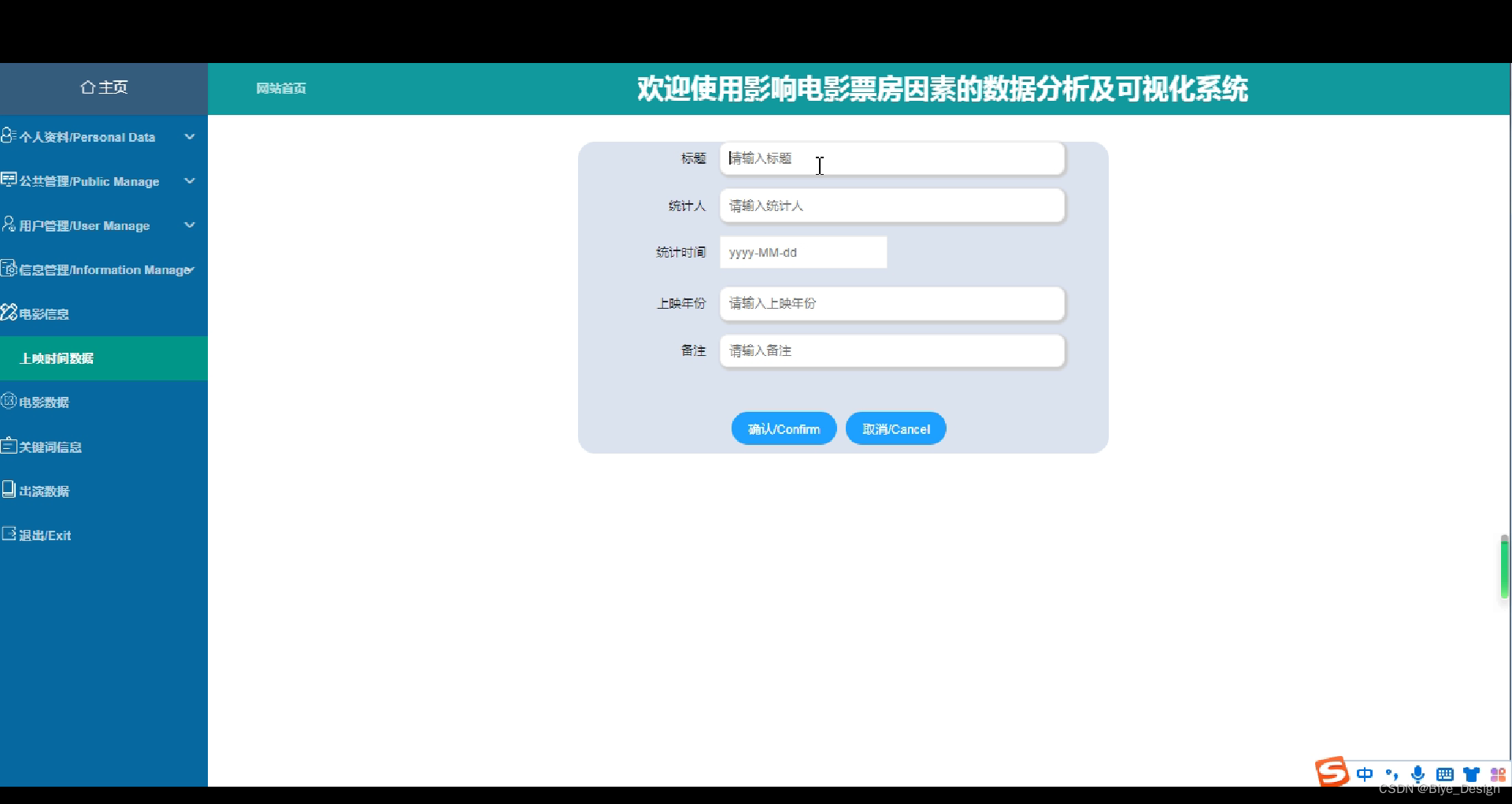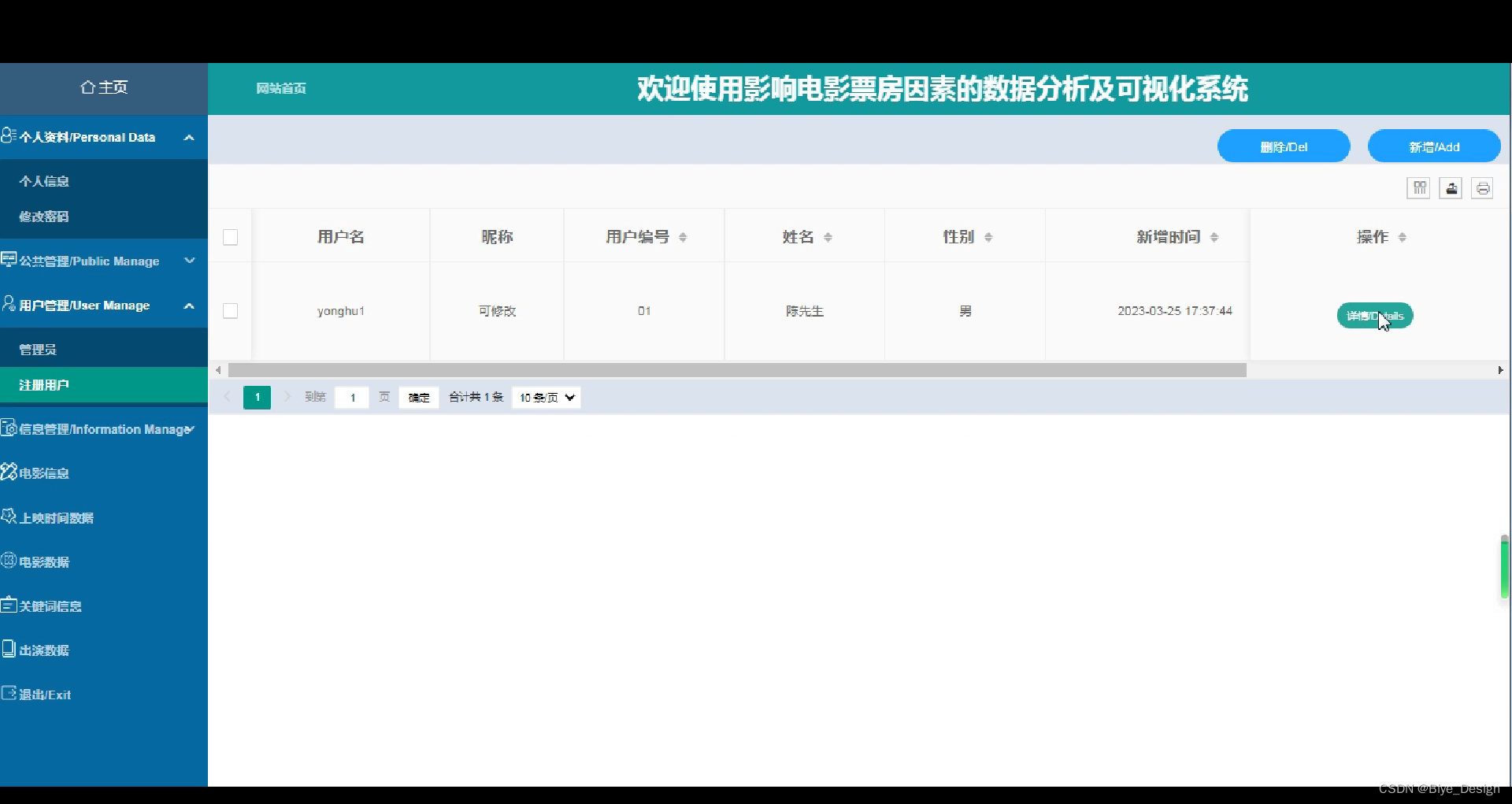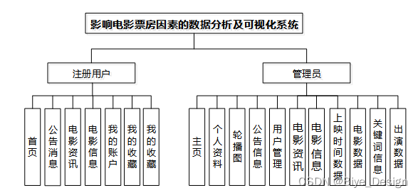 影响电影票房因素的数据分析及可视化系统主要是通过爬取网络上的电影相关数据,为上映时间数据,电影数据,关键词信息,出演数据的数据分析及可视化提供了方便的机制。本系统目前有两类使用者,一是注册用户,其次就是管理员。