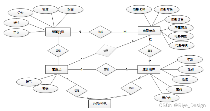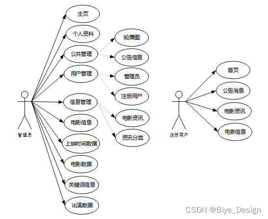 管理员主要负责个人资料,公共管理(轮播图,公告消息),用户管理(管理员,注册用户),信息管理(电影资讯,资讯分类),电影信息,上映时间数据,电影数据,关键词信息,出演数据等的管理;注册用户功能有首页,公告消息,电影资讯,电影信息等。下图所示描述管理员及用户的用例图。