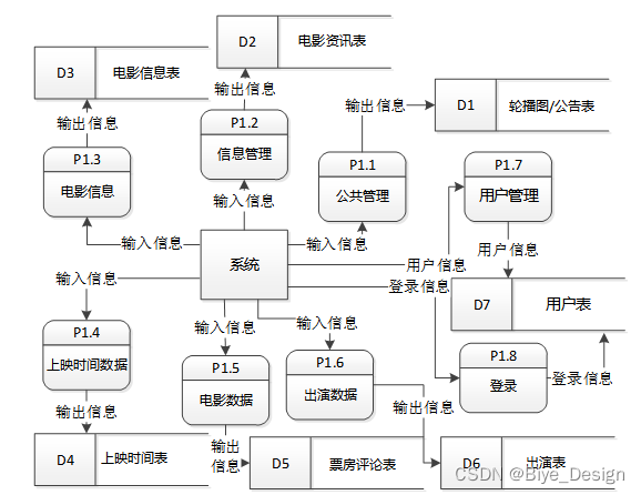 如下为系统的顶层数据流图,外部实体有用户和管理员,分别对系统输入数据,从而得到要输出的数据。