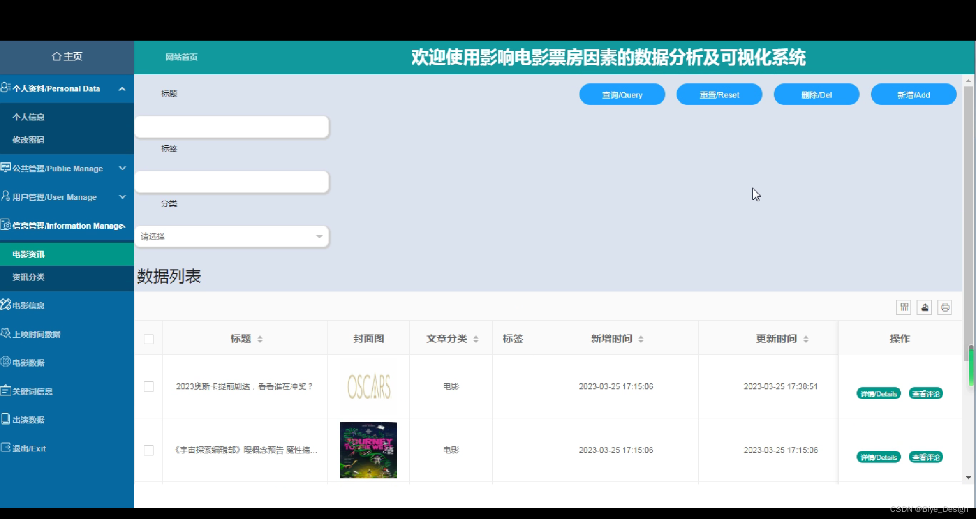 管理员在此管理界面可以维护管理电影资讯,包括标题,封面图,分类,标签等信息,可以进行查询,重置,删除,新增等操作,界面如下所示。