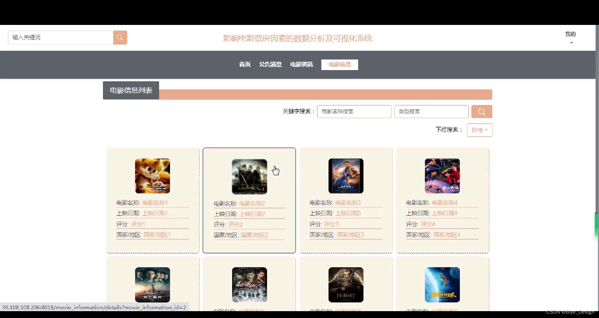 (1) 电影列表:展示所有电影信息,形成的列表样式。通过电影名、电影类目来搜索电影。