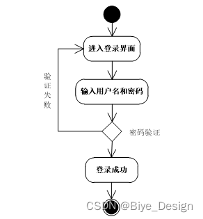 用户可进行登录使用更多功能,首先进入用户登录界面,输入用户账号和密码,后台对账号和密码信息进行核对验证,验证成功则页面直接显示登录用户昵称代表登录成功,否则返回用户登录界面。用户登录活动图如下图。