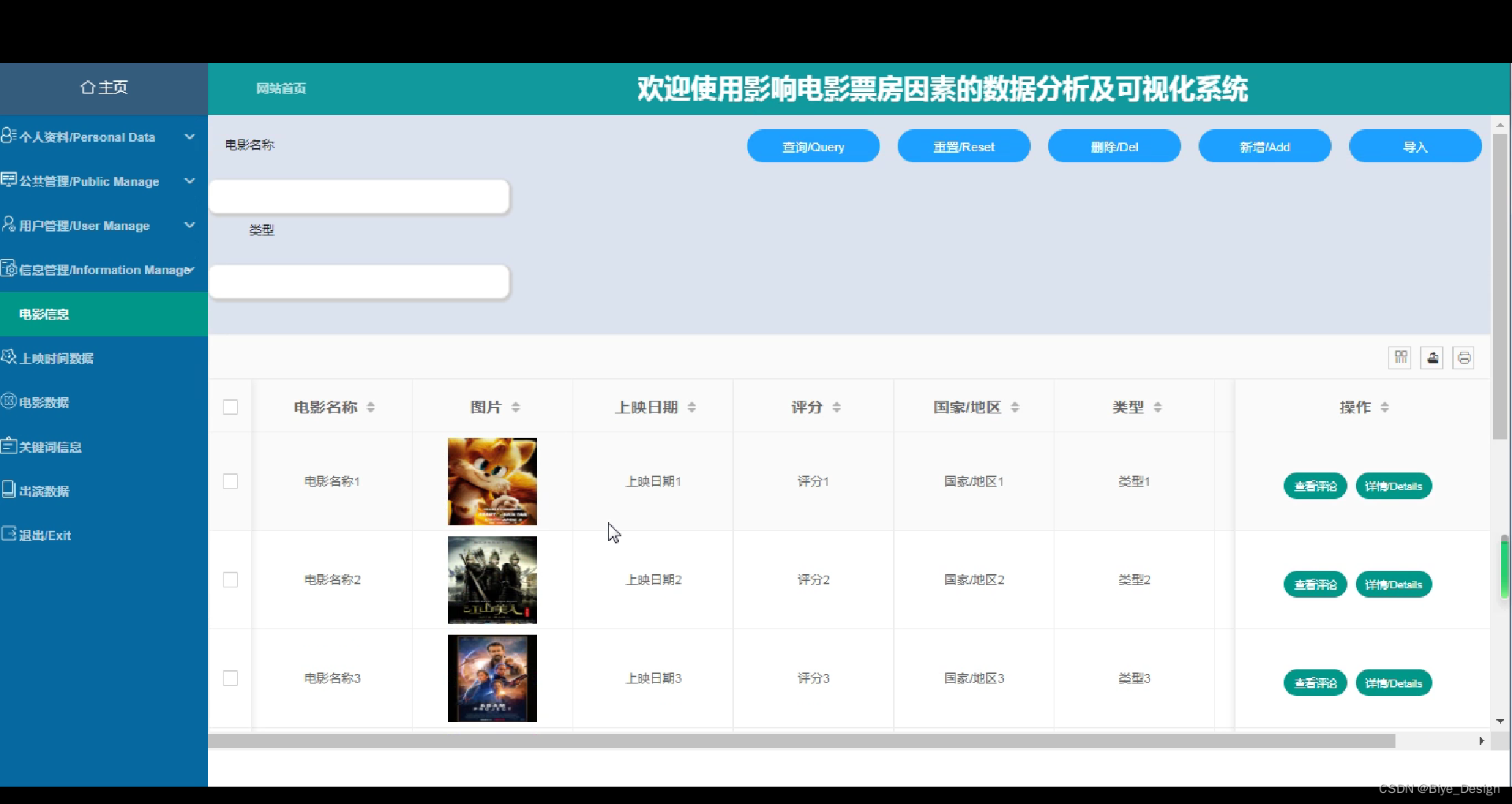 管理员在此管理界面可以维护管理电影信息,包括电影名称,年份,评分,所属国家,导演等信息,可以进行查询,重置,删除,新增,导入,导出等操作,界面如下所示。