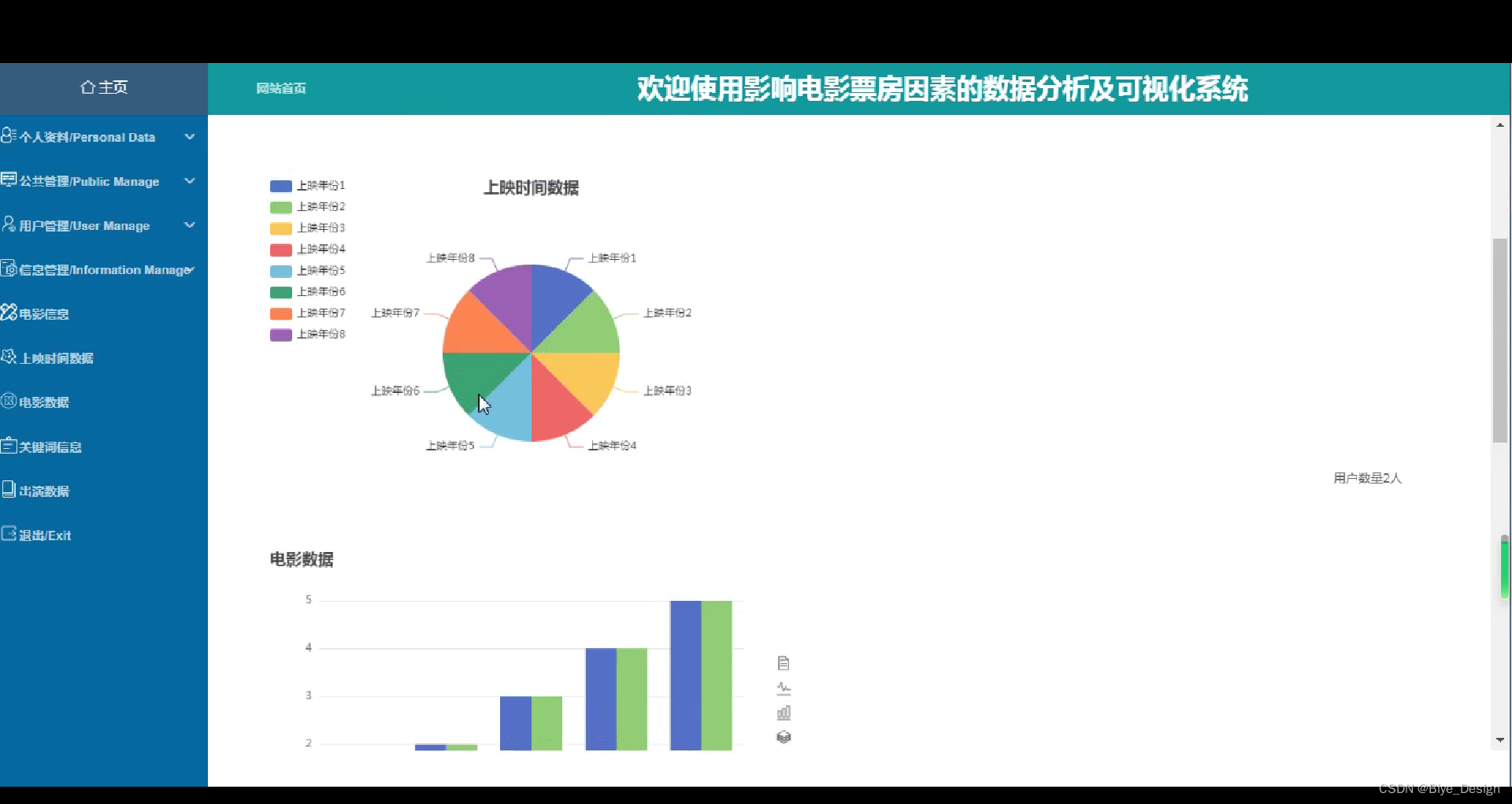 数据分析及可视化:对上映时间数据,电影数据,关键词信息,出演数据进行统计,并同步到后台首页的各类可视化图表中。