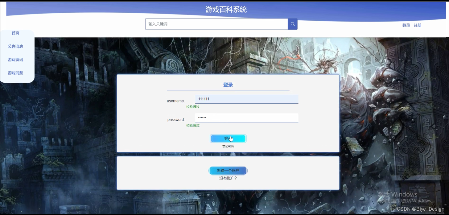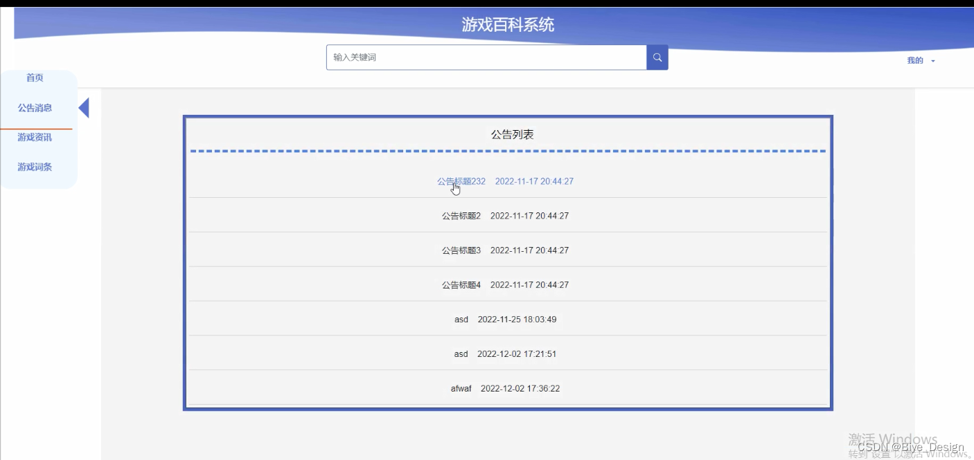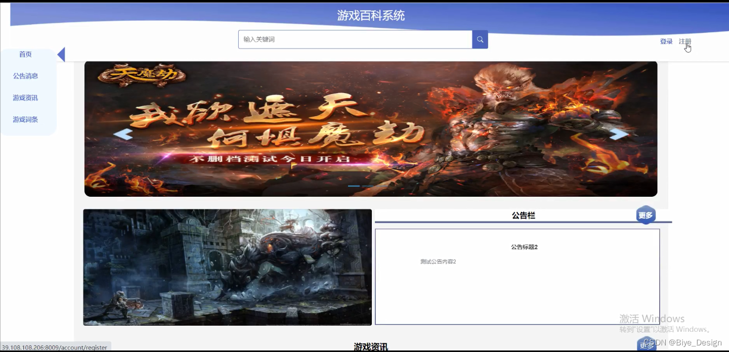 前台模块只要是让普通用户和游客用户使用,包括首页、公告消息、游戏资讯、游戏词条,后台可以对数据进行添加、删除、修改及查询等操作。