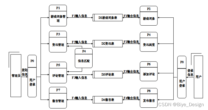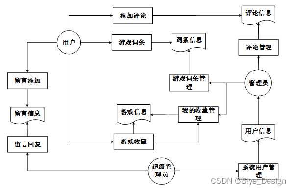 系统数据流图中,数据流实体主要是管理员,数据流程包括留言管理;数据流包括添加信息、删除信息、修改信息、查询信息、浏览信息、提示信息;数据表包括资讯表、游戏词条表。
