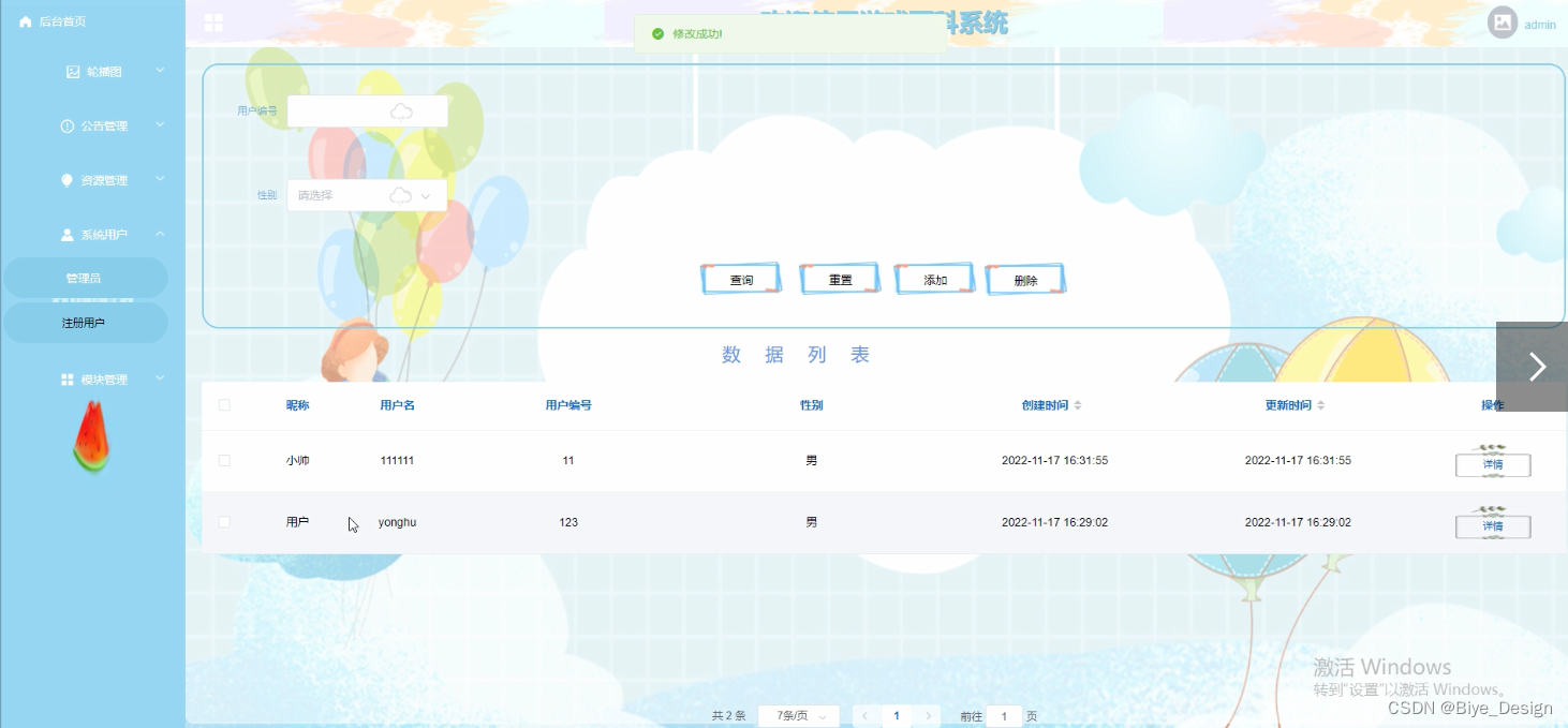- 系统用户管理:不管是超级管理员还是普通管理员都需要管理系统用户,包括普通管理员的添加、删除、修改、查询,修改管理员的登录密码,新添加的管理员用户可以登录系统。