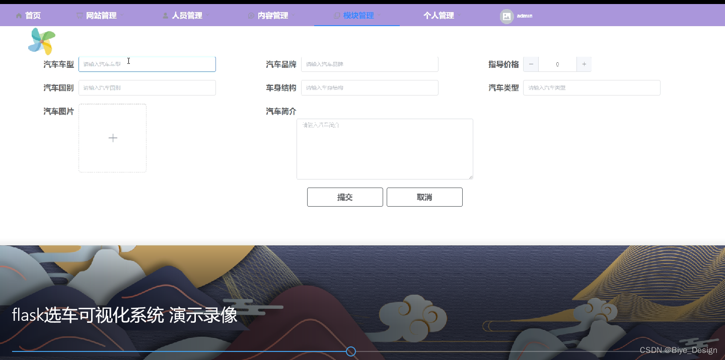 后台首页,网站管理(轮播图,通知公告),人员管理(普通用户、管理员),内容管理(汽车资讯、资讯分类),模块管理(销量数据、汽车信息、品牌销量、车型销量、价格走势、价位销量),个人管理等功能模块。