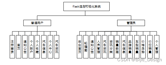 选车可视化系统的功能主要分为用户和管理员,实现首页,网站管理(轮播图,通知公告),人员管理(普通用户、管理员),内容管理(汽车资讯、资讯分类),模块管理(销量数据、汽车信息、品牌销量、车型销量、价格走势、价位销量),个人管理等功能模块。
