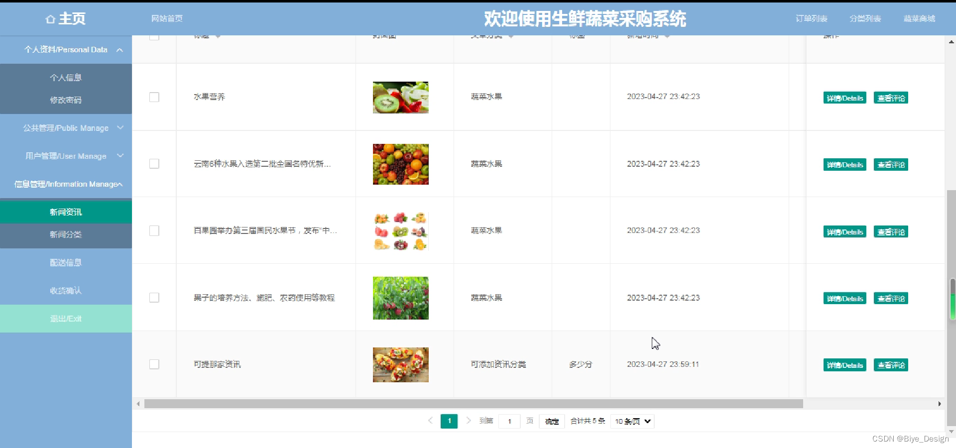 管理员在后台可以对生鲜蔬菜采购系统中显示的新闻资讯及其资讯分类信息进行增删改查,界面如下图4-13所示。