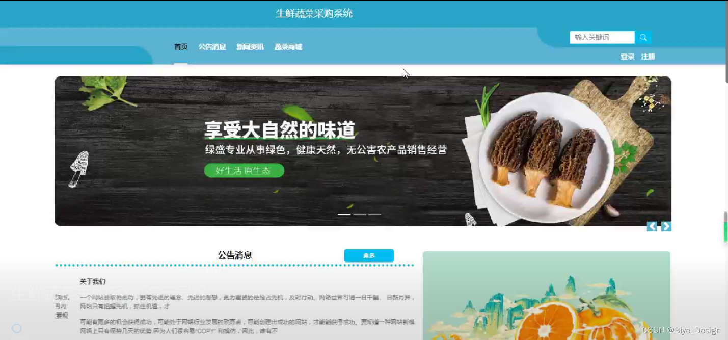 当进入生鲜蔬菜采购系统的时候,首先映入眼帘的是系统的导航栏,下面是轮播图以及系统内容,其主界面展示如下图4-1所示。