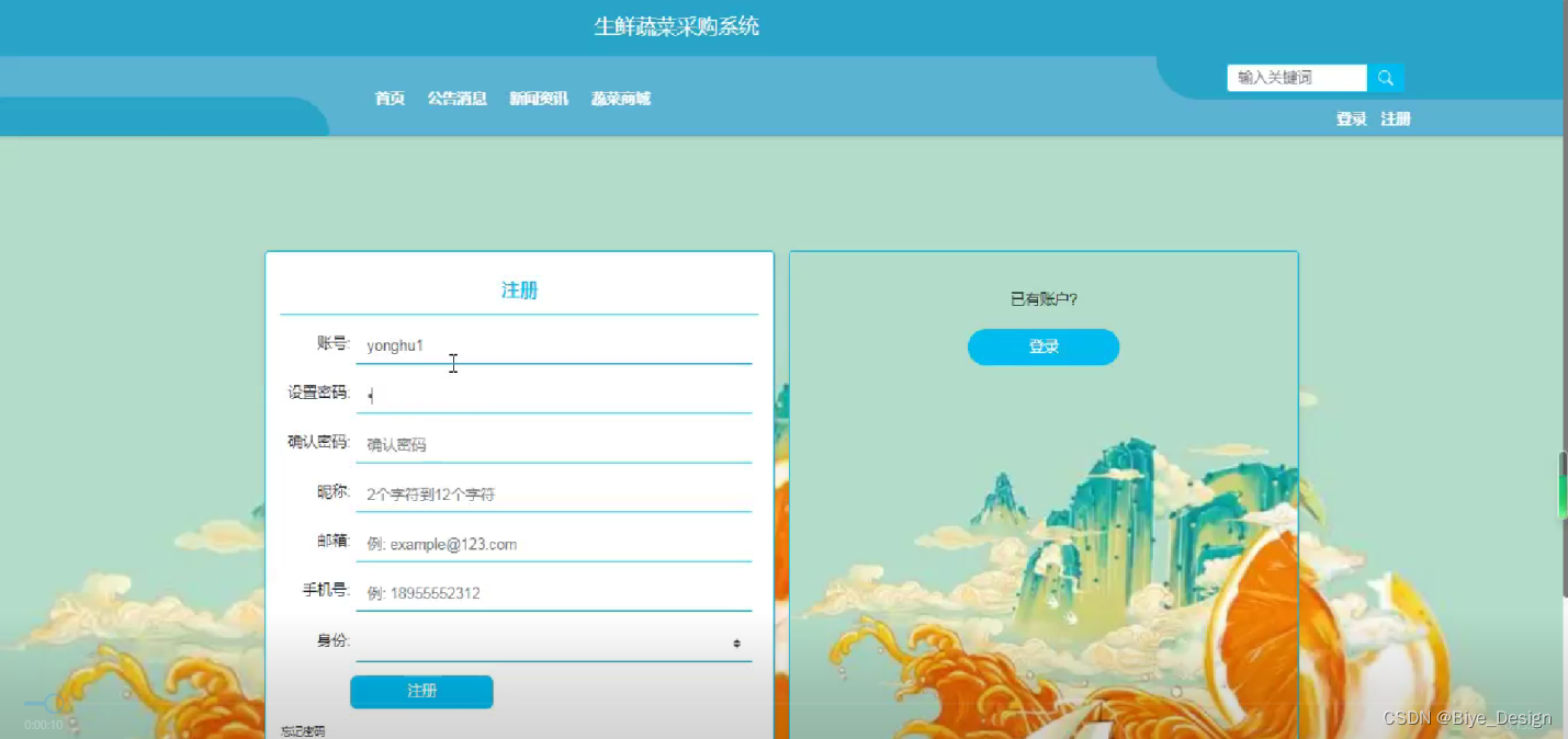 普通的用户只支持对网站信的浏览,想要购买或者交流就必须登录到系统,如果你没有本生鲜蔬菜采购系统的账号的话,添加“注册”根据提示输入好用户信息后,点击“注册”按钮后,系统会对输入的信息进行验证,验证输入的账户名和数据库表中已经注册的账户名是否重复,只有都验证没问题后即可会员注册成功。其用会员注册界面展示如下图4-2所示。