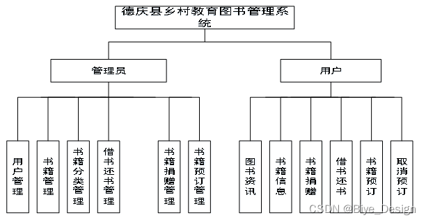 根据用户对系统的需求,要求系统简单操作,能够准确,完整的对信息进行管理。德庆县乡村教育图书管理系统在对需求做解析后,整个系统主要分为两个部分:管理员和普通用户,每个模块下的分支功能不一样。对功能做出如下说明: