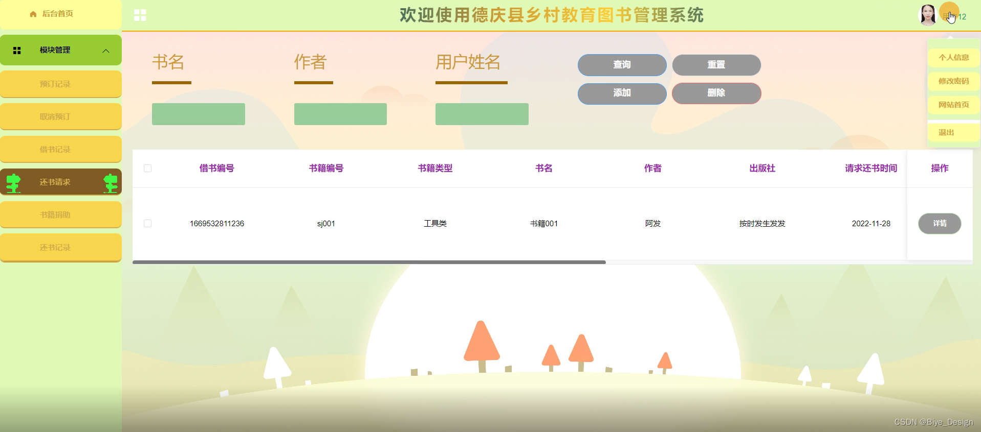 根据市场调研得到的信息数据,结合国内外前沿研究,利用相关系统开发和设计方法,最终设计出德庆县乡村教育图书管理系统。