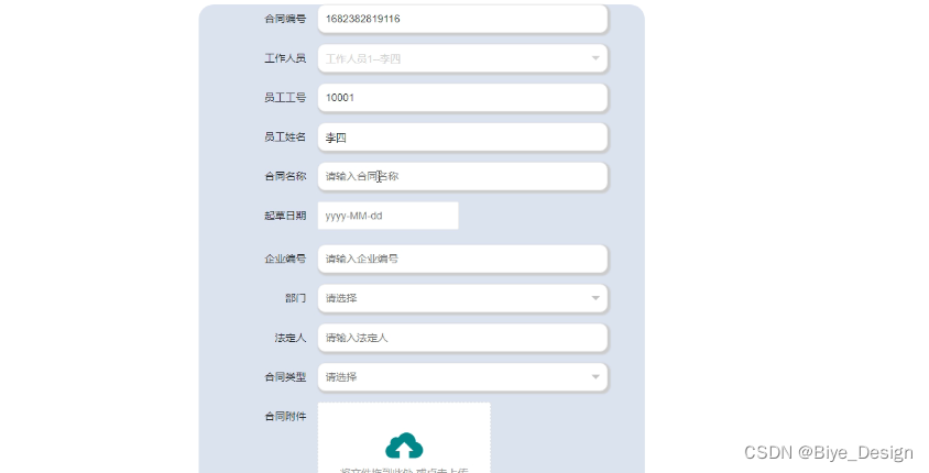 起草合同:工作人员可以新增填写合同信息,包括人员名称,工号,部门,法定人,合同类型,上传合同附件等信息。