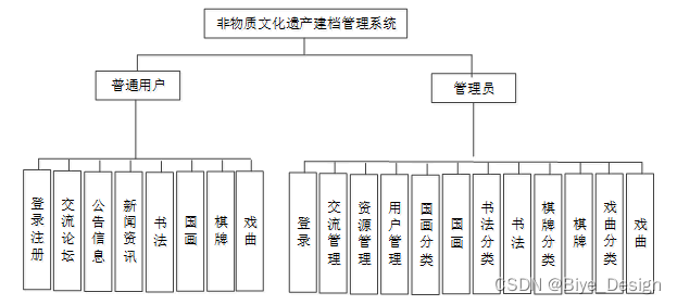 (3)确定好系统使用的技术,进行在线确认系统所划分的用户触,并且根据用户触划分确定所要设计的功能模块,对中非物质文化遗产建档管理系统的设计主要划分别为管理员和用户触,并所使用的功能模块也相应不同,但系统的数据库实现的内容是交互的,你可以随时根据自己的需求进行国画分类搜索,对于系统工作人员可以根据自己的分管内容进行在线信息的处理及操作,管理员获取到所有用户的详细数据信息,并根据需求进行第一时间处理解决。