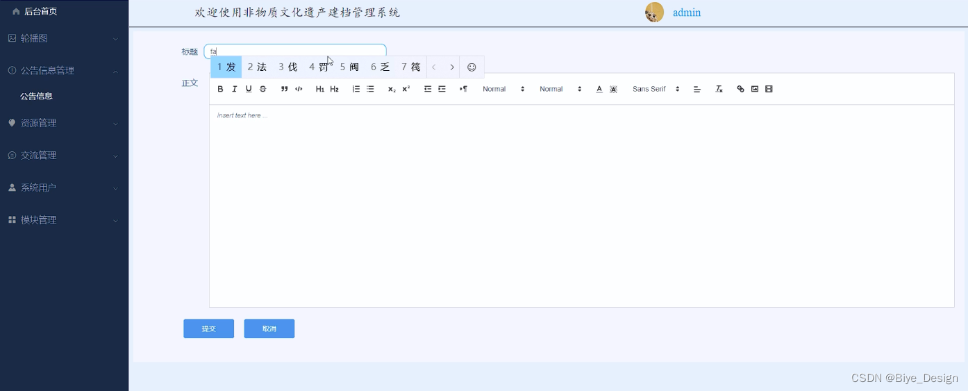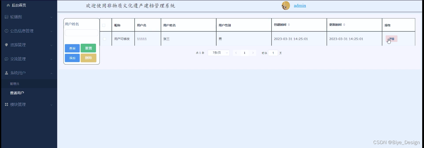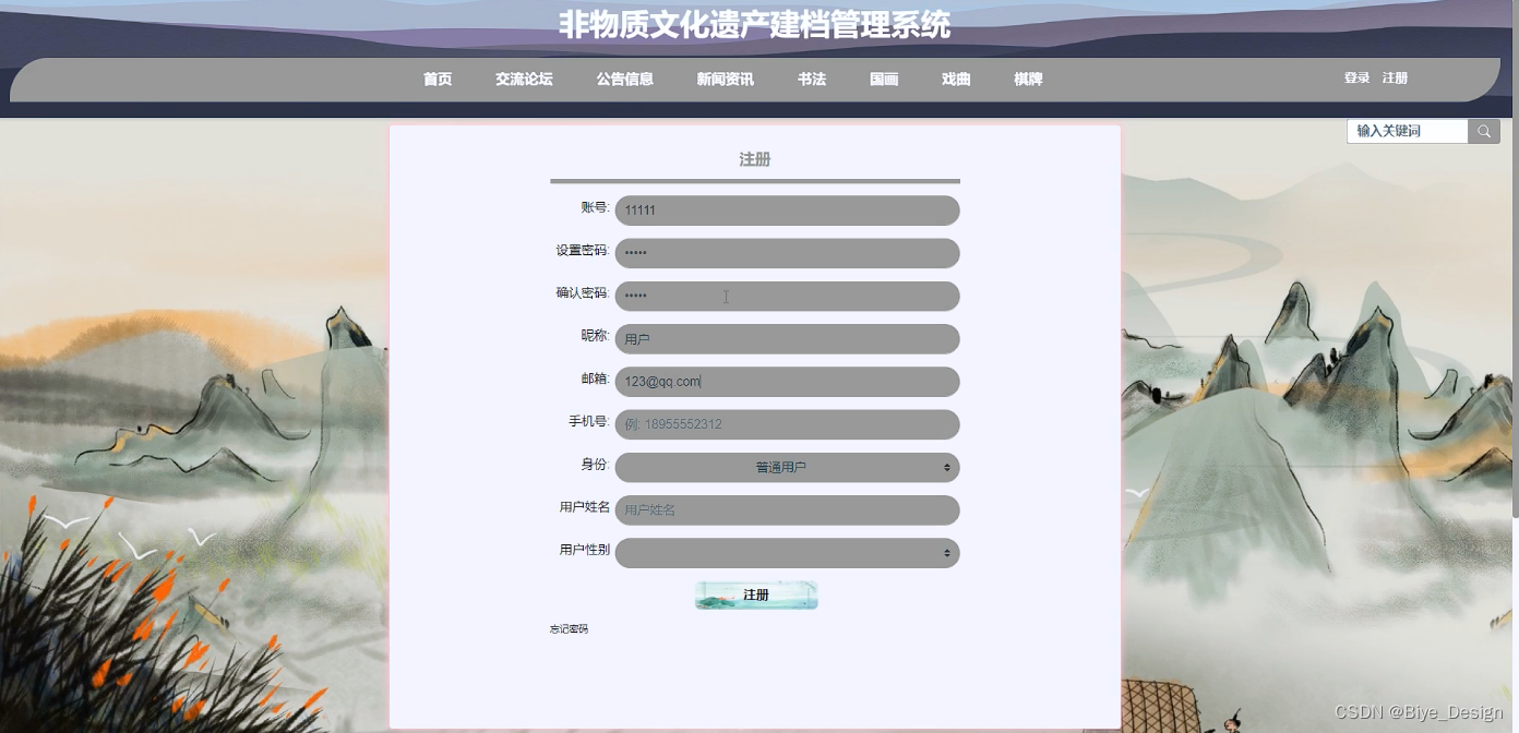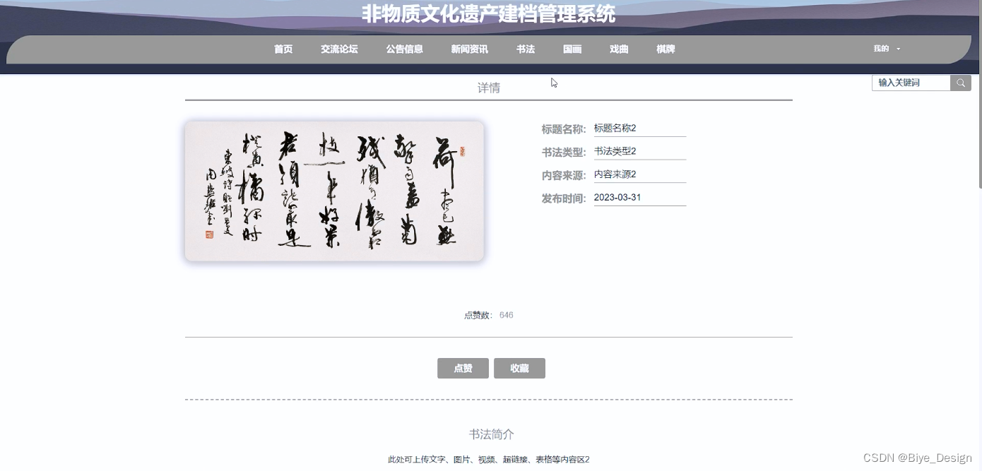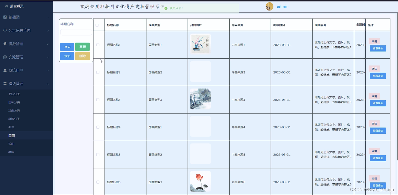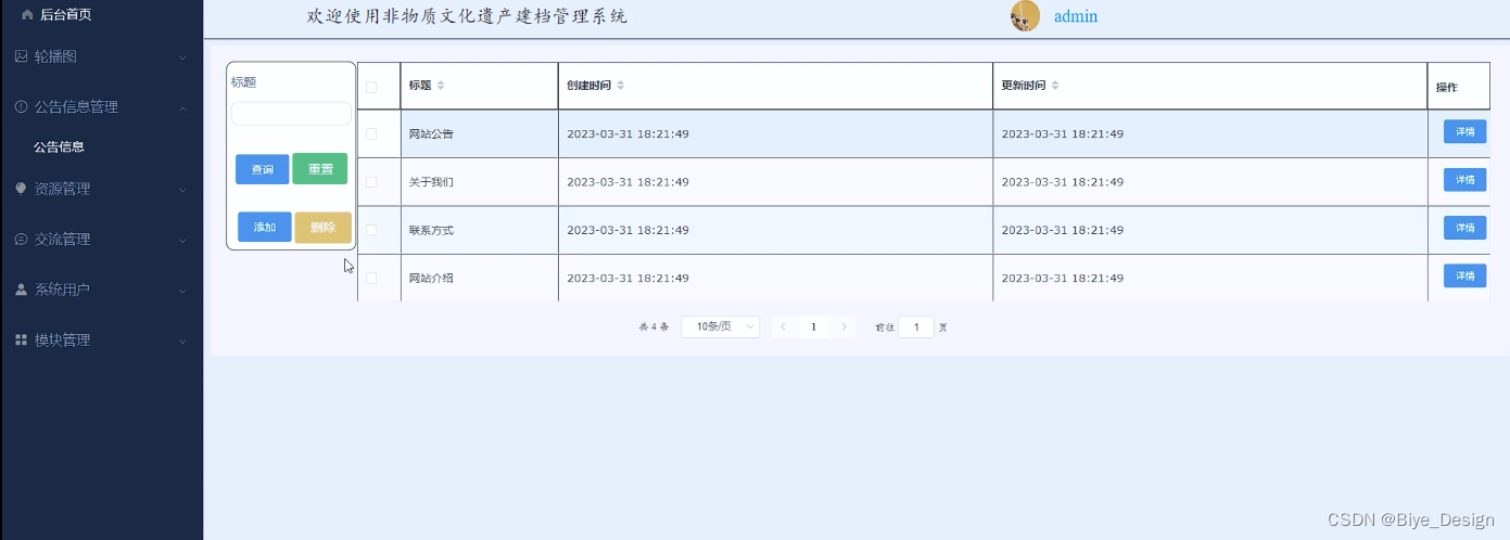 系统管理也都将通过计算机进行整体智能化操作,对于非物质文化遗产建档管理系统所牵扯的管理及数据保存都是非常多的,例如管理员;首页、轮播图(轮播图管理)人员管理(管理员、普通用户)资源管理(新闻资讯、资讯分类)交流管理(交流论坛、论坛分类列表)模块管理(书法分类、国画分类、棋牌分类、戏曲分类、书法、国画、戏曲、棋牌)等,这给管理者的工作带来了巨大的挑战,面对大量的信息,传统的管理系统,都是通过笔记的方式进行详细信息的统计,后来出现电脑,通过电脑输入软件将纸质的信息统计到电脑上,这种方式比较传统,而且想要统计数据信息比较麻烦,还受时间和空间的影响,所以为此开发了非物质文化遗产建档管理系统;为用户提供了方便管理平台,方便管理员查看及维护,并且可以通过需求进行内容的编辑及维护等;对于用户而言,可以随时进行查询所需信息,管理员可以足不出户就可以获取到系统的数据信息等,而且还能节省用户很多时间,所以开发非物质文化遗产建档管理系统给管理者带来了很大的方便,同时也方便管理员对用户信息进行处理。