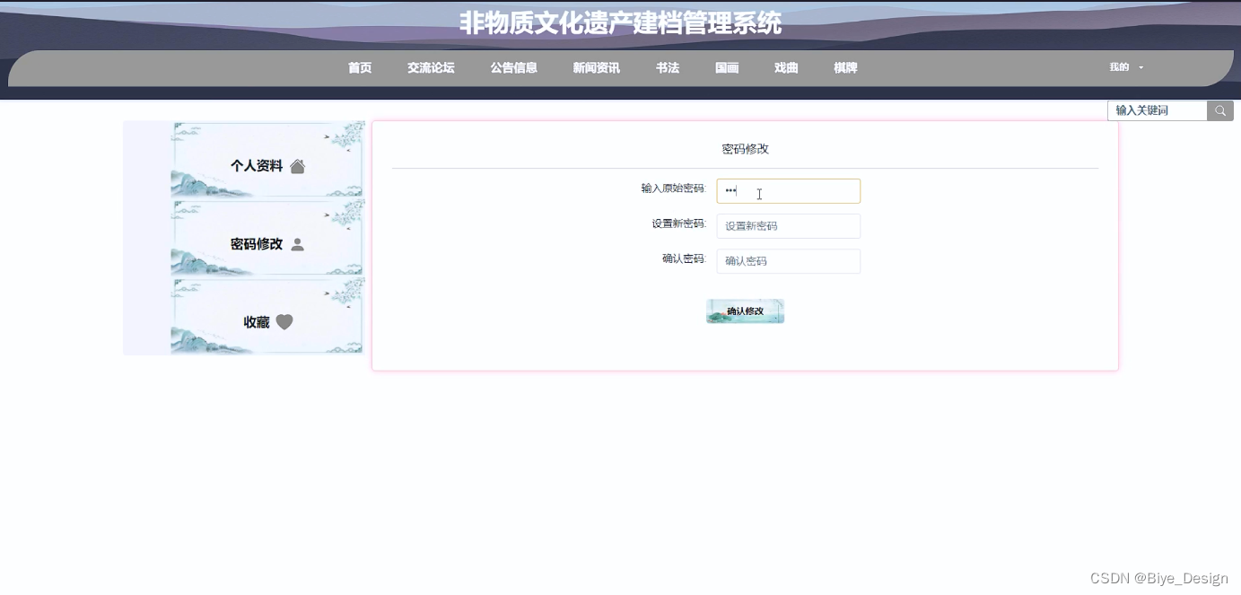 用户使用该非物质文化遗产管理系统注册完成后,用户对登录密码有修改需求时,系统也可以提供用户修改密码权限。系统中所有的操作者能够变更自己的密码信息,执行该功能首先必须要登入系统,然后选择密码变更选项以后在给定的文本框中填写初始密码和新密码来完成修改密码的操作。在填写的时候,假如两次密码填写存在差异,那么此次密码变更操作失败,下面的图片展示的就是该板块对应的工作面。
