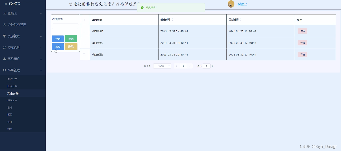 管理员点击“戏曲分类”会显示出所有的戏曲分类信息,支持输入戏曲类型对戏曲分类信息进行查询,如果想要添加新的戏曲分类信息,点击“添加”按钮,输入戏曲类型等信息,点击“提交”按钮就可以添加了,同时可以选择某一条戏曲分类信息,点击“删除”进行删除。