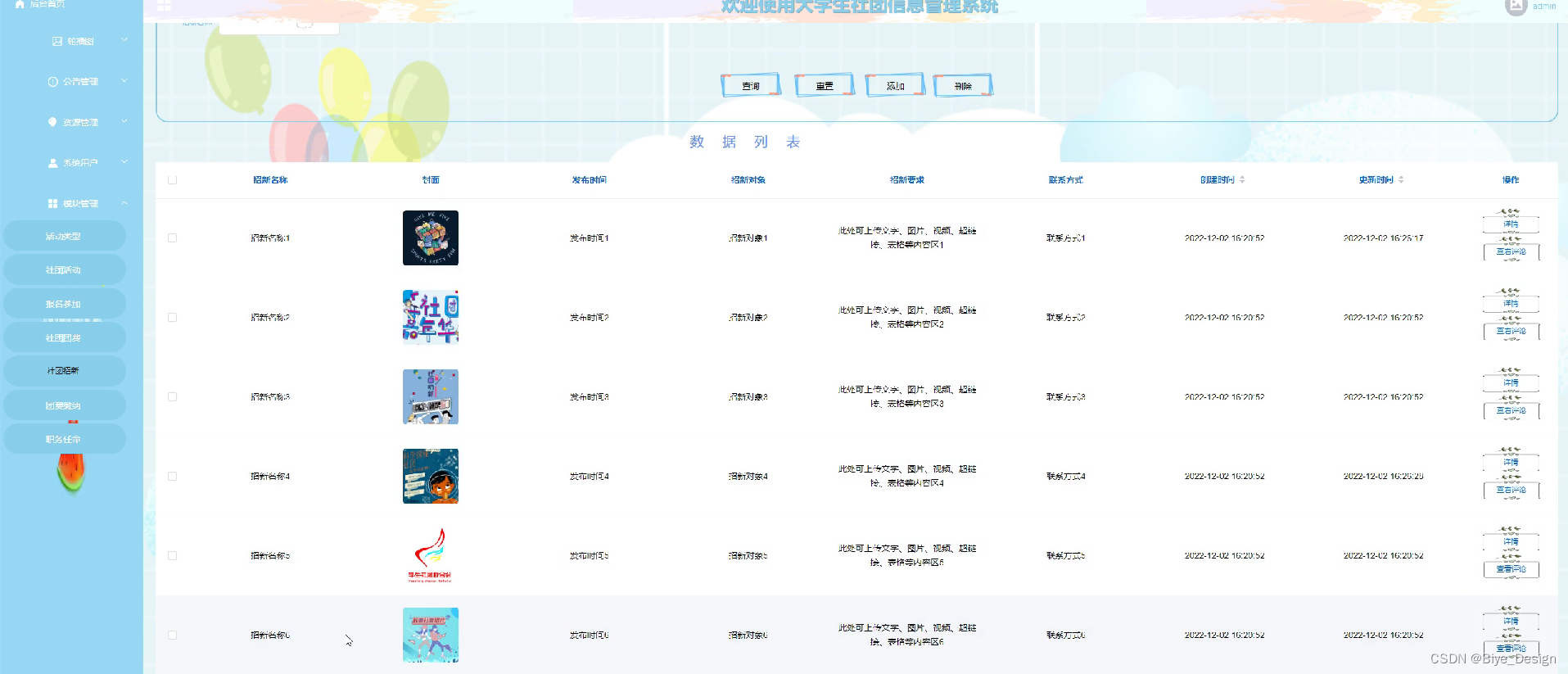 社团招新,在此管理页面可以社团招新活动行查询,重置,添加,删除等操作,如图5-7所示。