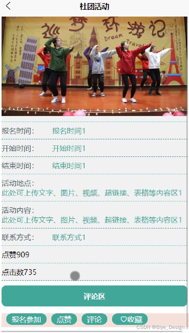 社团活动,在此页面可以查看推荐的社团活动,可以选择报名参加,点赞,评论,收藏等操作,如图5-11,5-11-1所示。