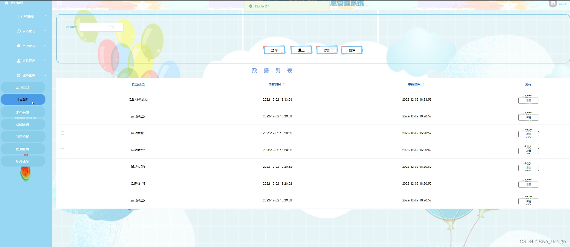管理员或社团部长在社团活动管理页面可以对活动内容及其分类进行查询,重置,添加,删除等操作,如图5-4,5-4-1所示。