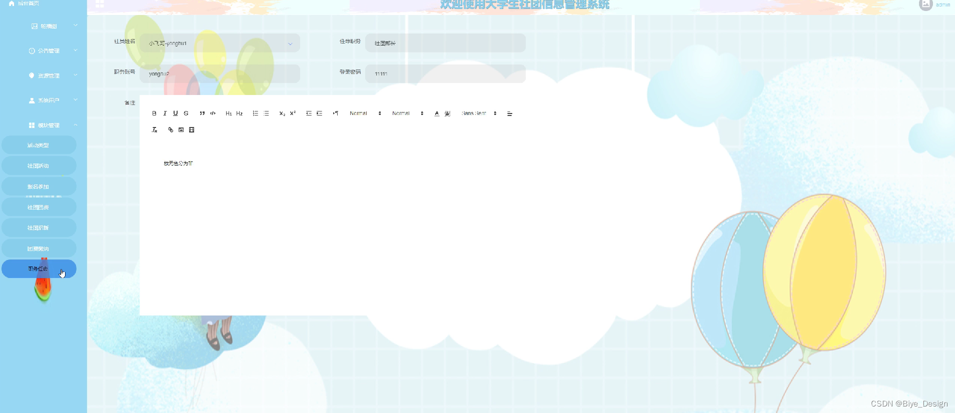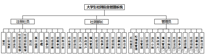 (1)功能要求:可以管理首页,轮播图管理,公告管理,资源管理(社团资讯,资讯分类),系统用户(管理员,注册社员,社团部长),模块管理(活动类型,社团活动,报名参加,社团团费,社团招新,团费缴纳,职务任命)等功能模块。