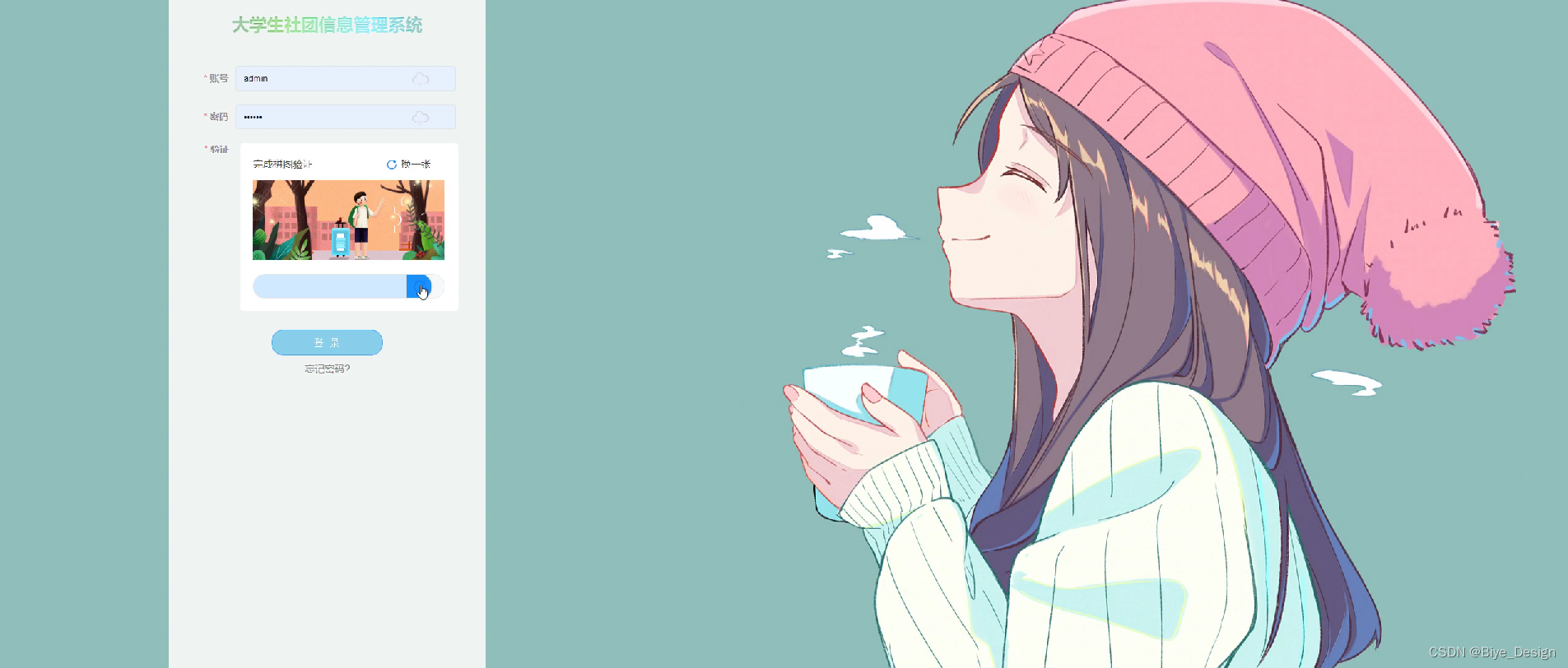 管理员登录,通过填写账号、密码、图片验证,输入完成后选择登录即可进入大学生社团信息管理系统APP,如图5-1所示。