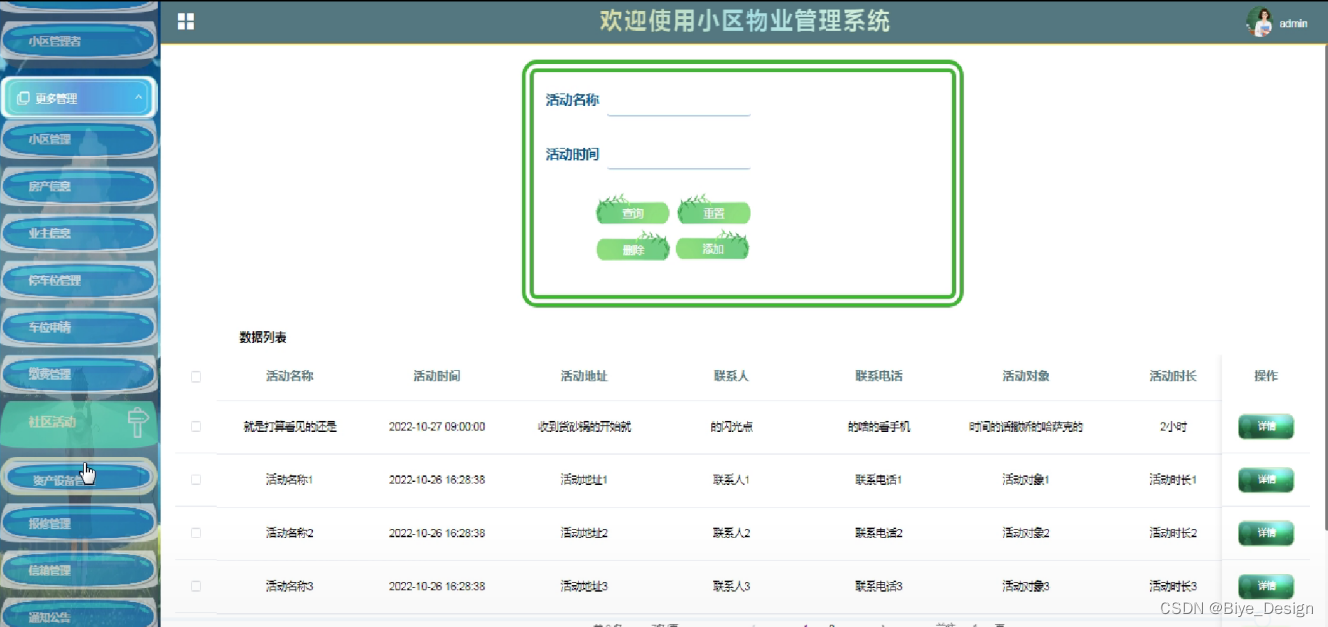 (4)社区活动管理:小区管理者点击“社区活动”这一按钮后会弹跳出社区活动列表、可以对活动进行增删改查操作;
