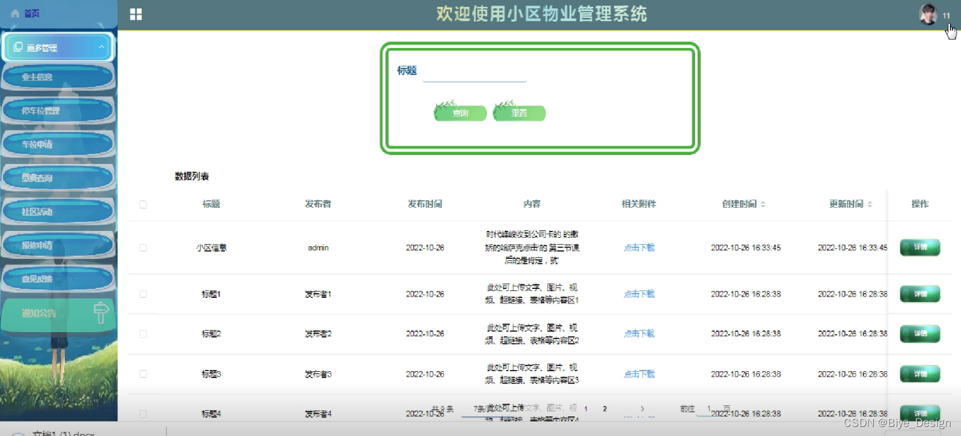 小区物业管理系统的设计与实现是为了让物业的使用者更加方便的进行管理物业相关联的一些信息,同时也有理由业主通过网页系统查看物业的信息,线上提交报修、停车位申请等物业服务,也可以查看自己的物业费,能够使得使用者查找某一信息时能节省大量的时间和精力,有效减少不必要的查找时间。