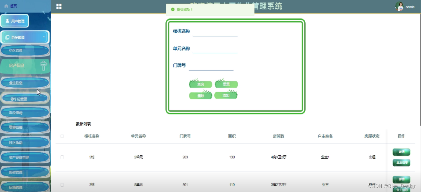 (3)房产信息管理:小区管理者在后台可以对房产信息进行增删改查操作;