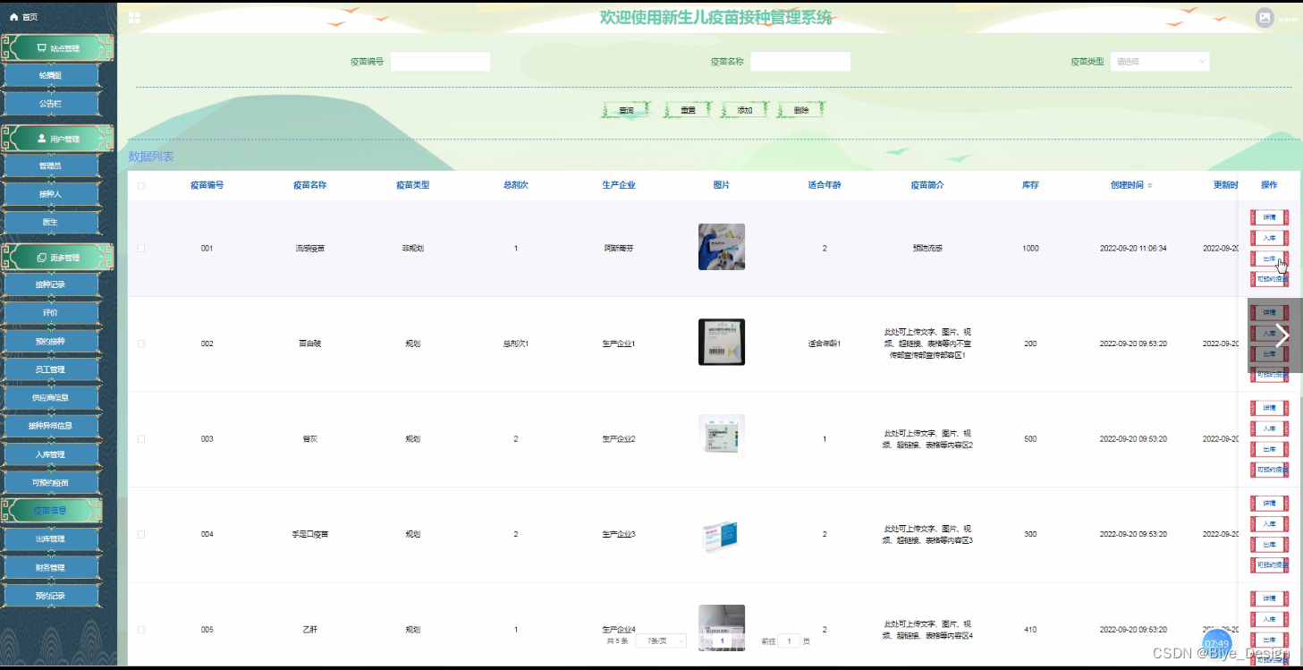 疫苗信息,在疫苗信息页面可以查看疫苗编号、疫苗名称、疫苗图片等信息操作,如图5-10所示。