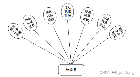 社区防疫管理系统的设计基于现有的互联网,可以实现管理员:健康打卡管理、出入申请管理、居民信息管理、活动轨迹管理、疫苗接种、接种预约、防疫物资、物资申请管理等详细的了解及统计分析。根据系统功能需求建立的模块关系图如下图: