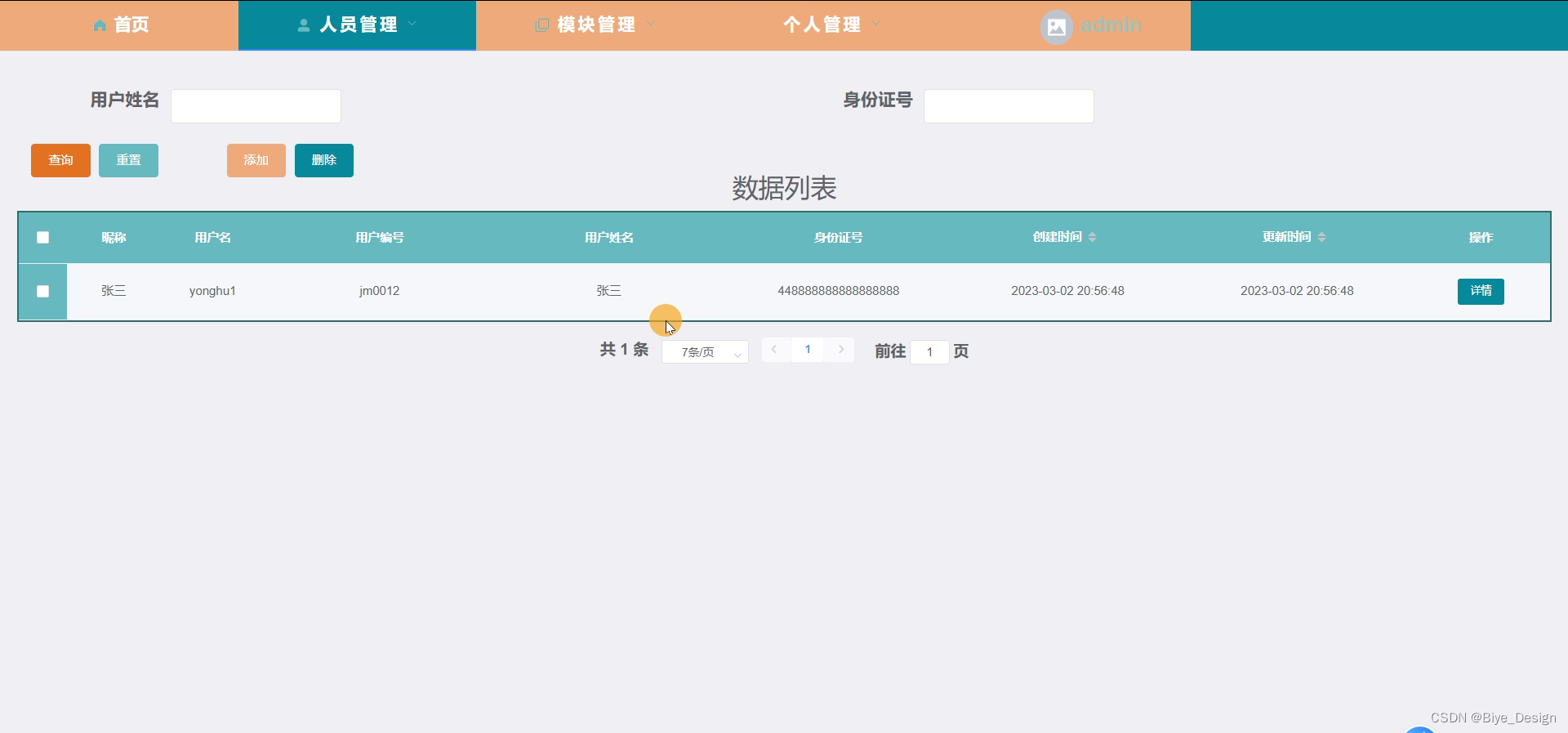 社区防疫管理系统中的管理人员是可以对前台注册的居民用户信息进行管理的,也可以对管理员进行管控。界面如下图5-8所示。