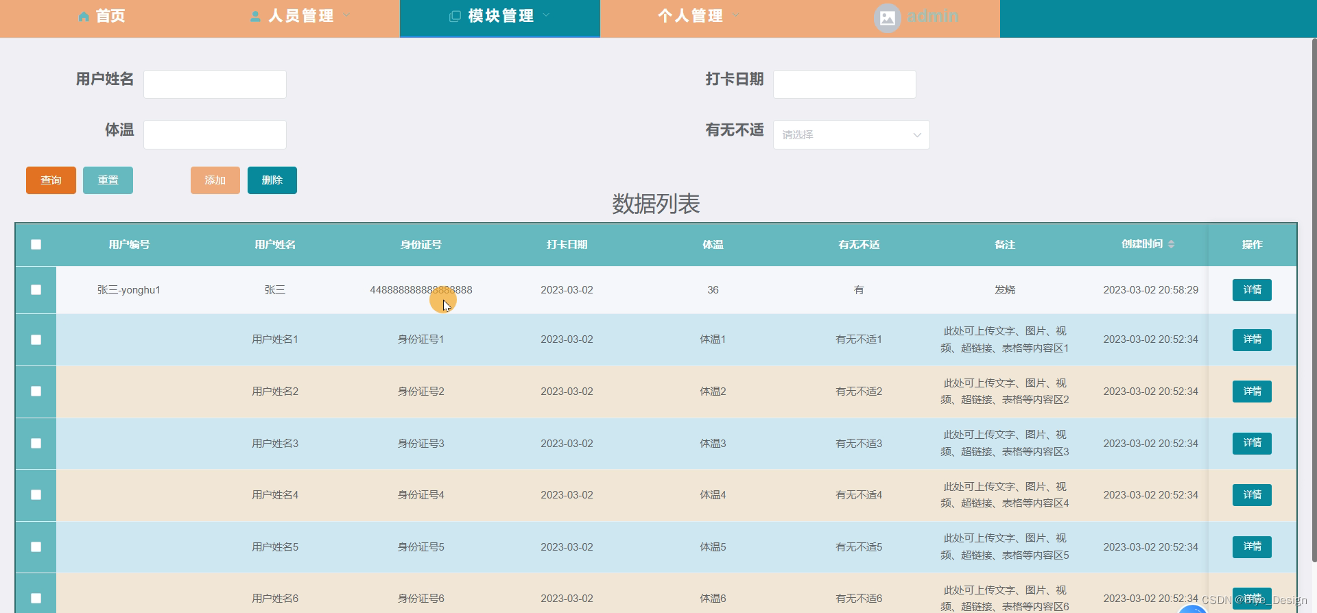 社区防疫管理系统中的管理人员是可以对居民的健康打卡信息进行管理,界面如下图5-9所示。
