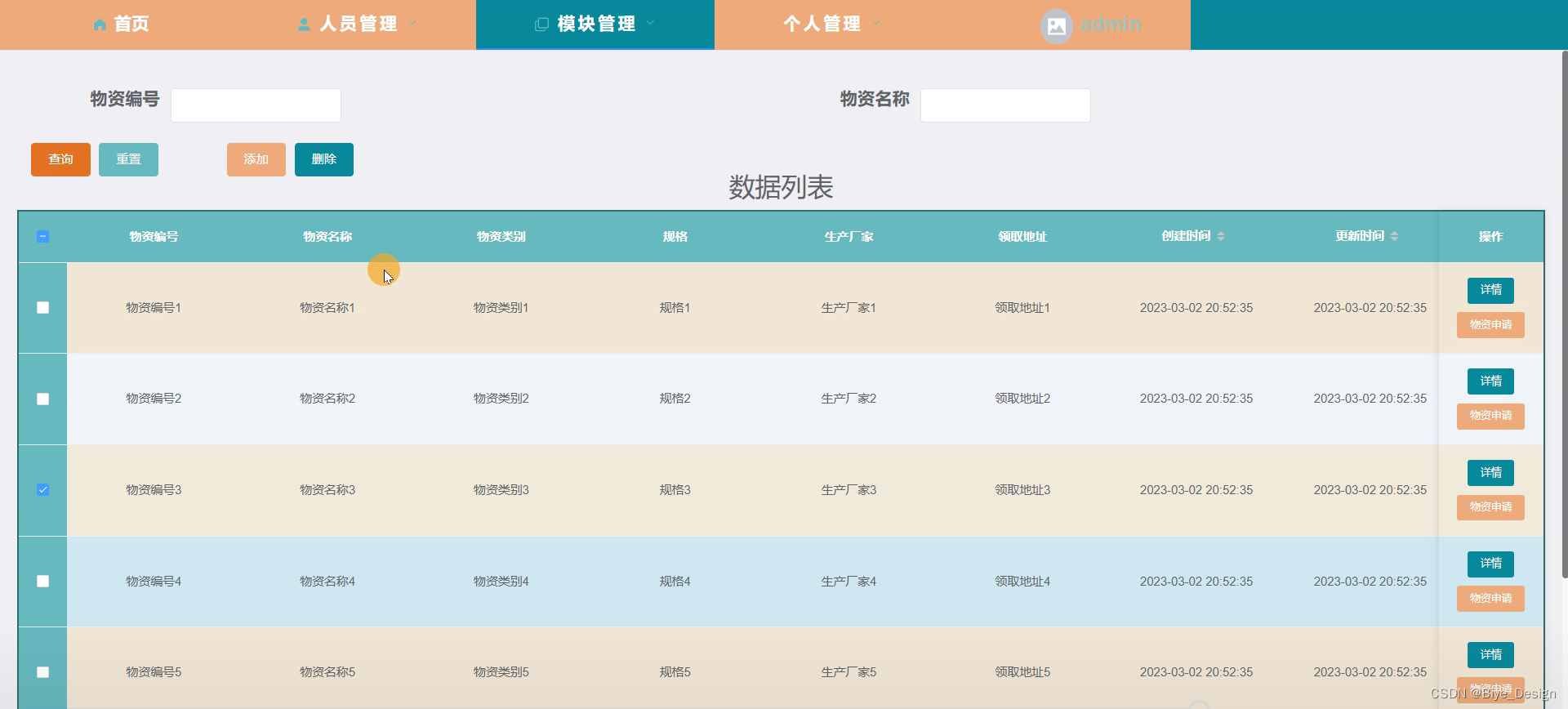管理员在“防疫物资管理”这一菜单下是可以对居民的防疫物资信息进行管理,其管理界面如下图5-11所示。