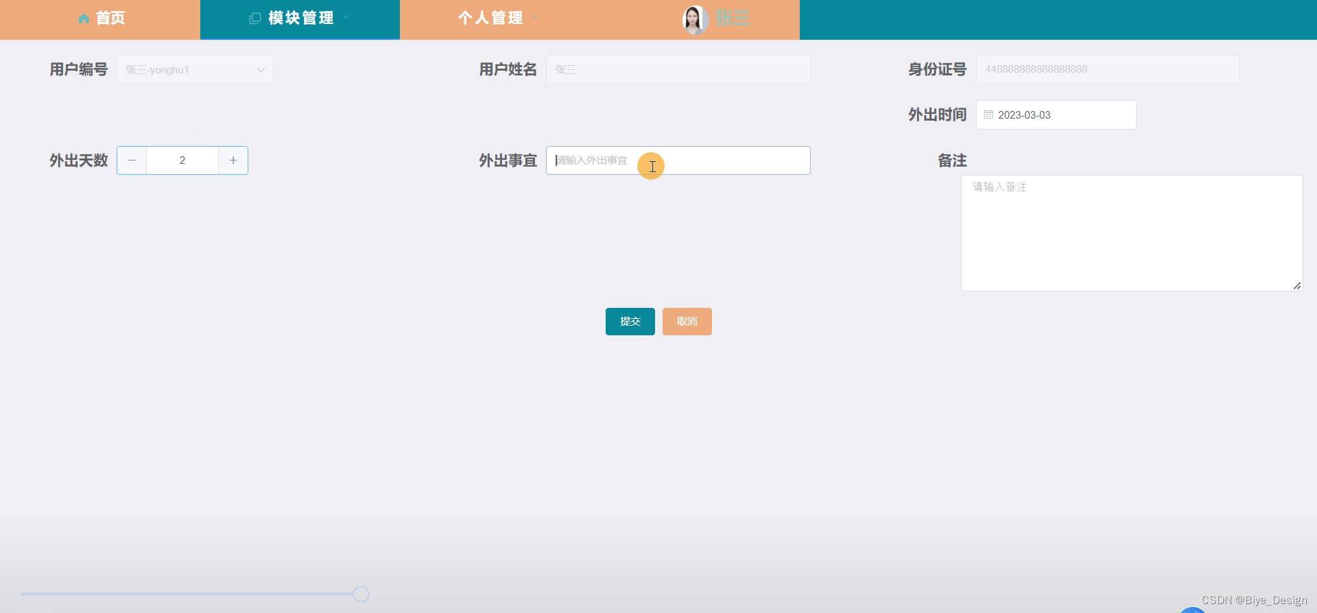 外出申请页面通过填写外出事宜、外出时间、外出天数等信息,并可以进行修改信息,如图5-4所示。