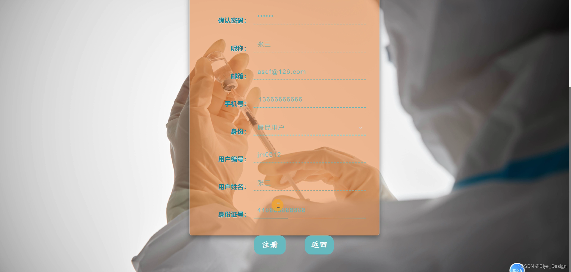 用户注册,在用户注册页面可以填写账号、密码、昵称、邮箱、手机号码、身份、性别、身份证号码等详细内容进行注册,如图5-3所示。