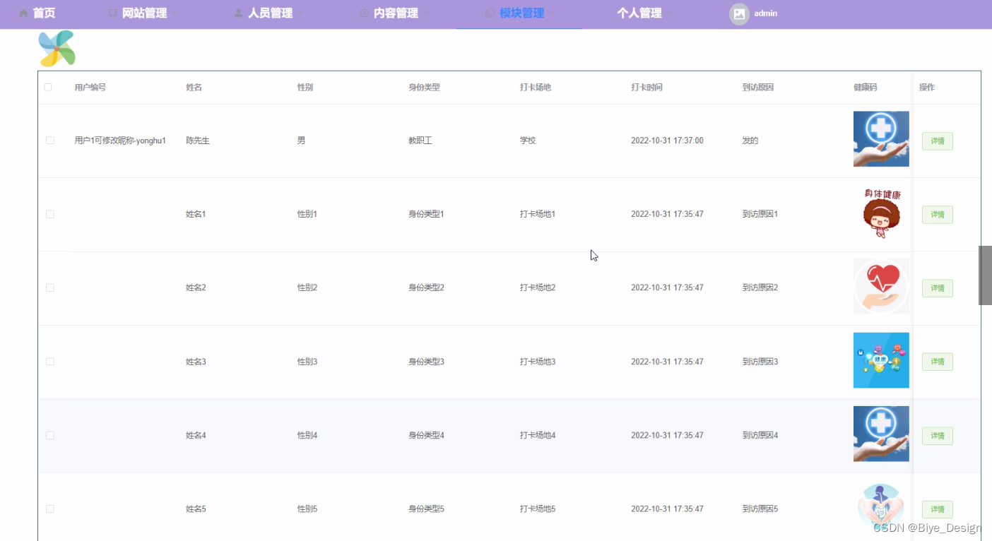 校园疫情防控系统所拥有的数据表有以下:场所打卡、数据上报、通行验证、数据报表、数据分析。