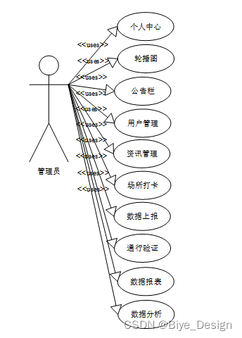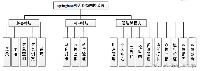 校园疫情防控系统的功能主要分为前台用户根据自己的需求进行注册登录,浏览数据信息并对选中的数据进行上传操作。管理员主要对注册用户,场所打卡、数据上报、通行验证、数据报表、数据分析信息进行处理。