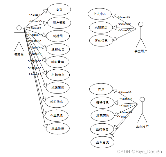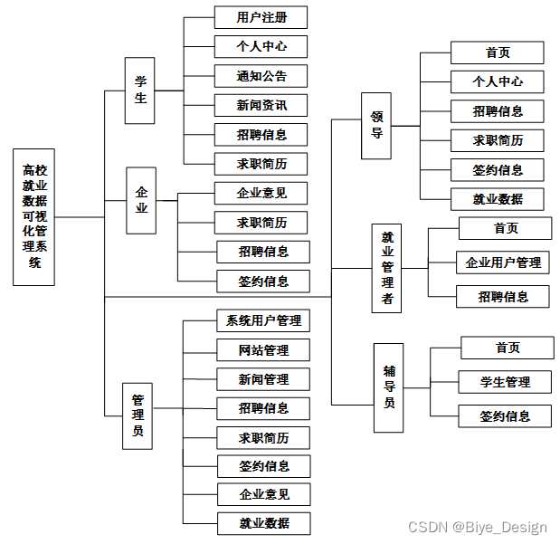 高校就业数据可视化管理系统的功能主要分为前台用户根据自己的需求进行注册登录,浏览职位信息并对选中的职位进行申请操作。管理员主要对注册用户,招聘信息、求职简历、签约信息、企业意见、就业数据进行处理。