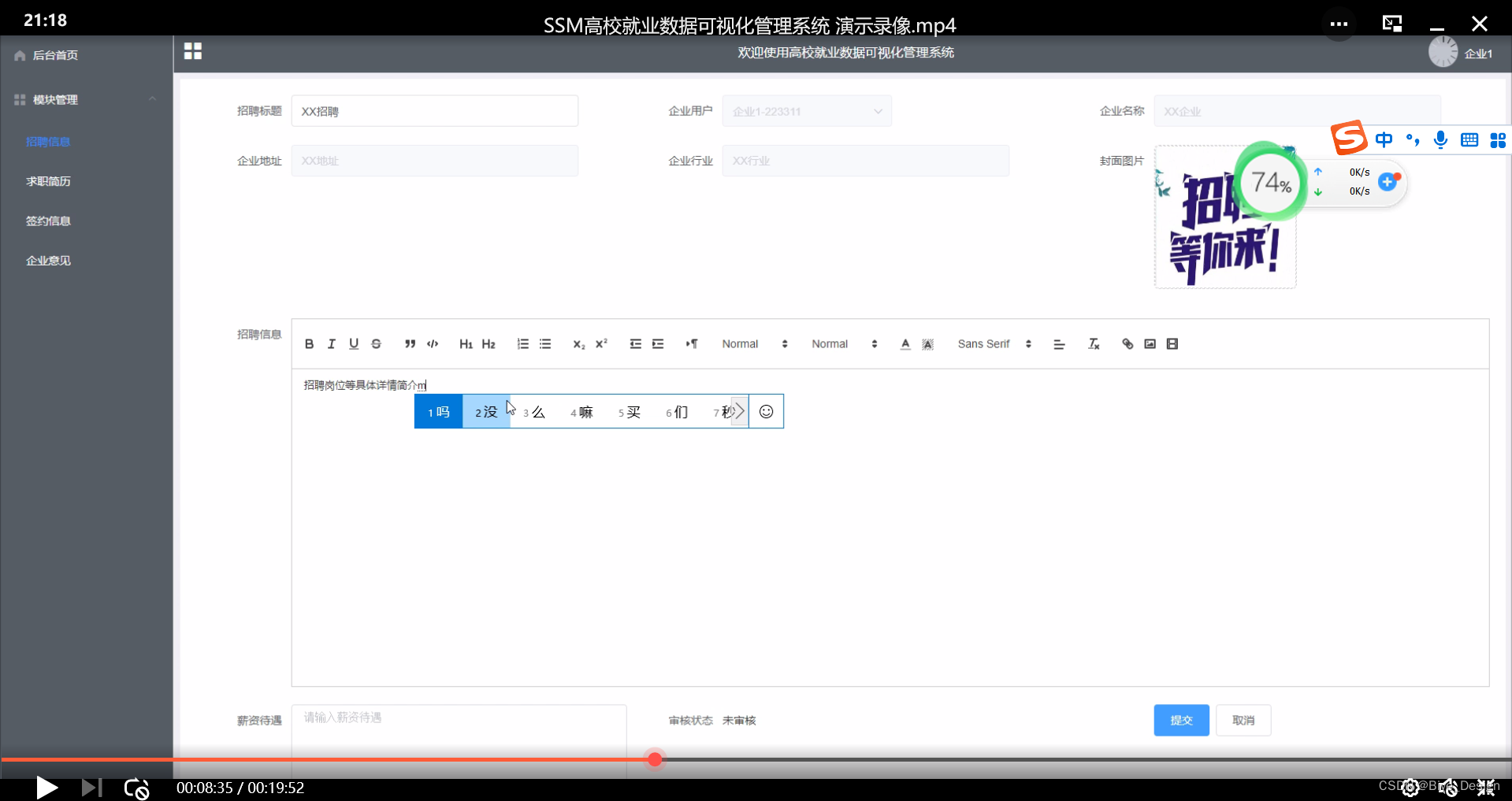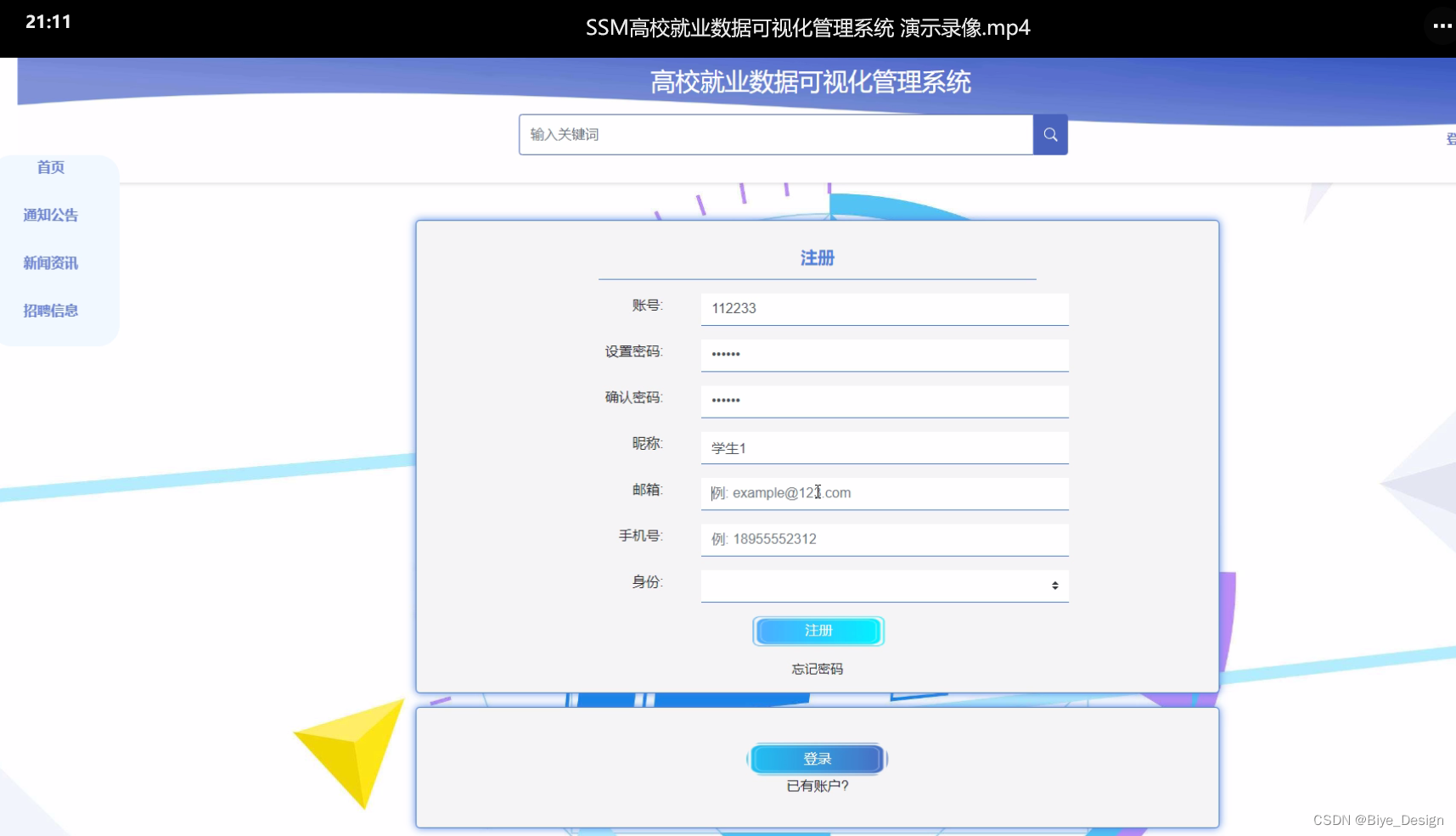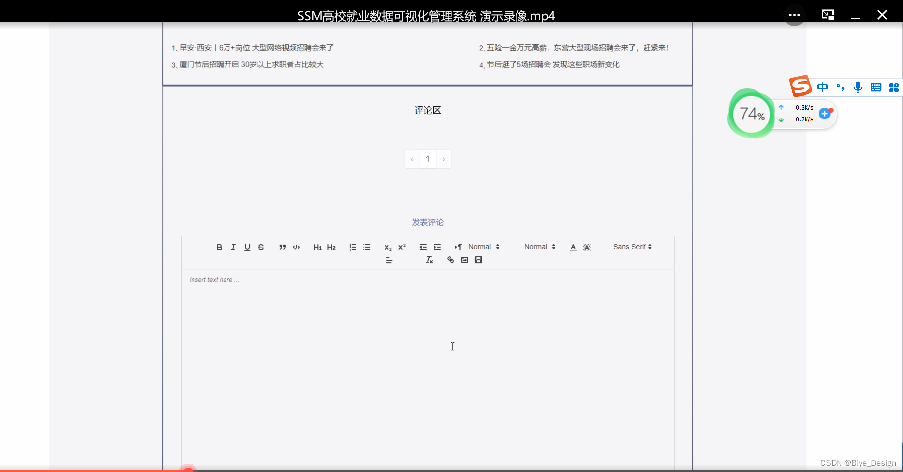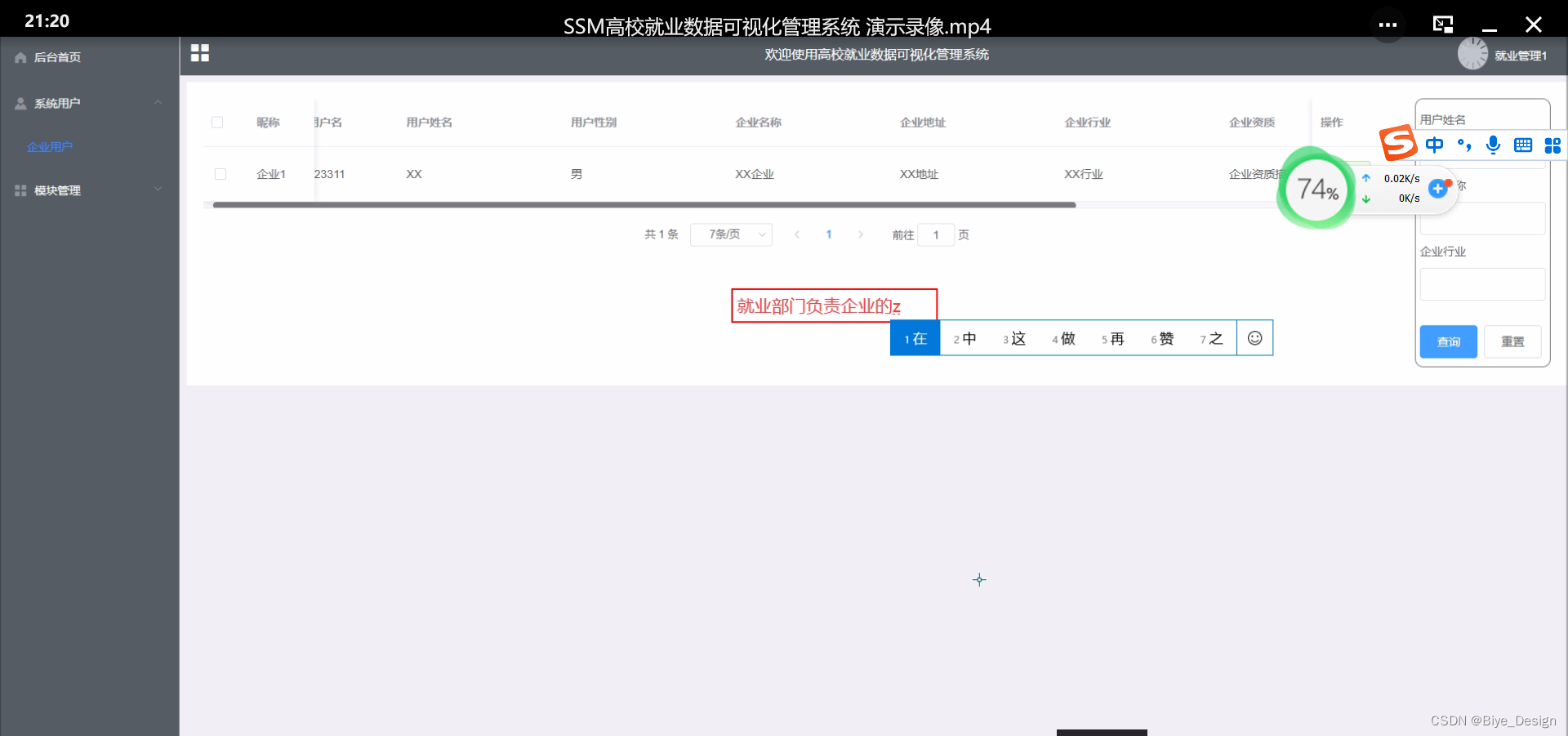 高校就业数据可视化管理系统主要功能模块包括系统首页、网站管理(轮播图、通知公告)人员管理(管理员、学生用户、企业用户)内容管理(就业资讯、资讯分类)模块管理(行业管理、招聘信息、投递简历、简历信息)个人管理,采取面对对象的开发模式进行软件的开发和硬体的架设,能很好的满足实际使用的需求,完善了对应的软体架设以及程序编码的工作,采取Mysql作为后台数据的主要存储单元,采用ssm框架、echars技术、Ajax技术进行业务系统的编码及其开发,实现了本系统的全部功能。本次报告,首先分析了研究的背景、作用、意义,为研究工作的合理性打下了基础。针对高校就业数据可视化管理系统的各项需求以及技术问题进行分析,证明了系统的必要性和技术可行性,然后对设计系统需要使用的技术软件以及设计思想做了基本的介绍,最后来实现高校就业数据可视化管理系统和部署运行使用它。
