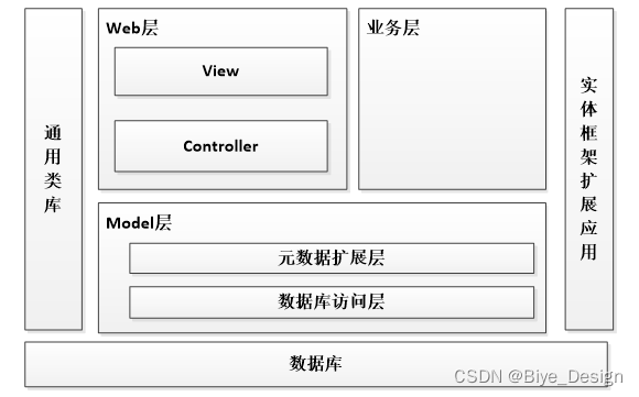 本高校就业数据可视化管理系统的架构设计主要分为可以3层,主要有Web层,业务层,Model层。其中web层还包括View层和Controller层,Model层包括元数据扩展层和数据访问层。