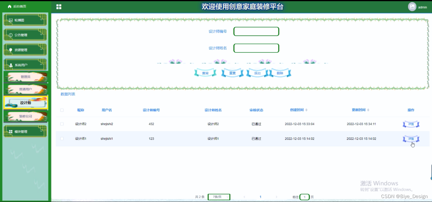 (3)系统用户管理:当点击“系统用户管理”这一菜单的时候,会出现管理员+普通用户+设计师+装修公司四个子菜单,可以对这四个模块进行增删改查操作;