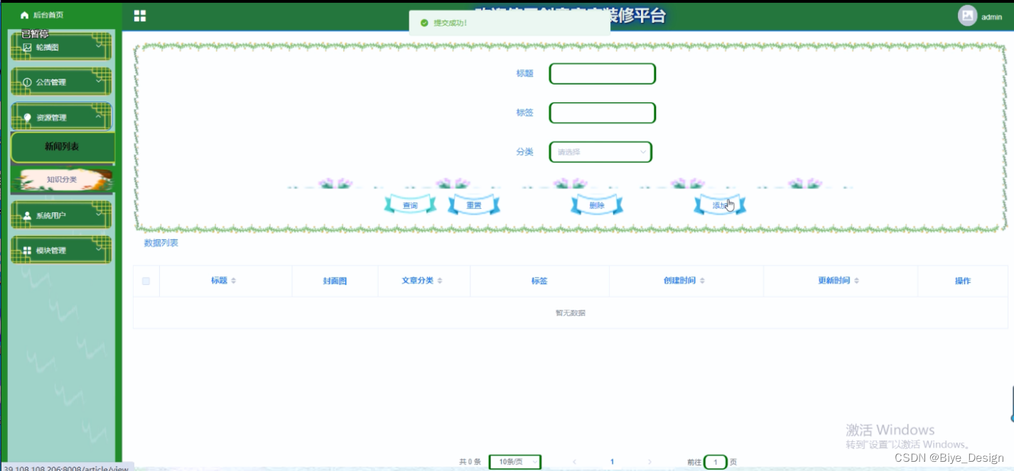 (4)资源管理:当点击“资源管理”这一菜单的时候,会出现新闻列表+知识分类这两个子菜单,可以对知识分类进行增删改查操作;