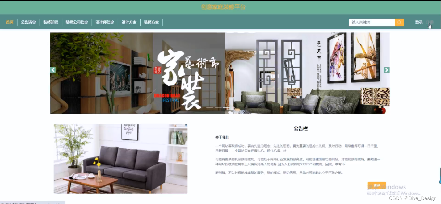 (2)查看创意家庭装修平台的首页信息:创意家庭装修平台的首页信息包含了首页、装修公司信息、公告消息、装修知识、设计师信息、设计方案、装修方案、我的(我的收藏、我的账户、个人中心)等。