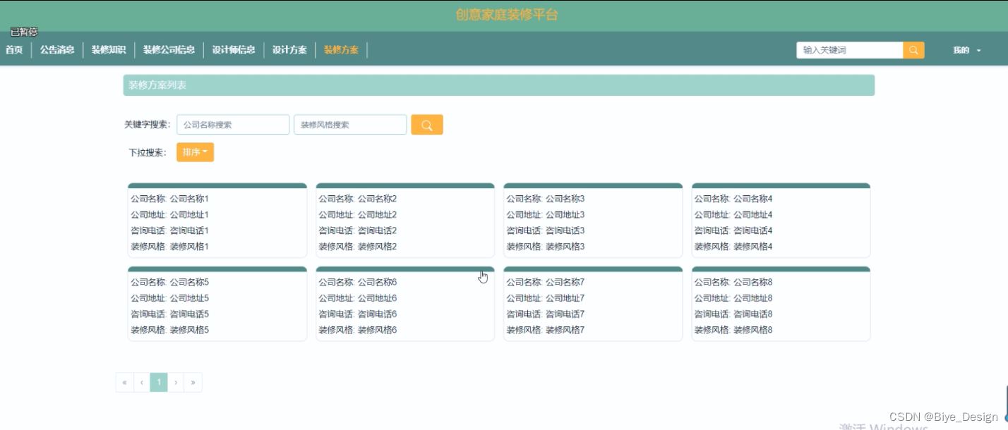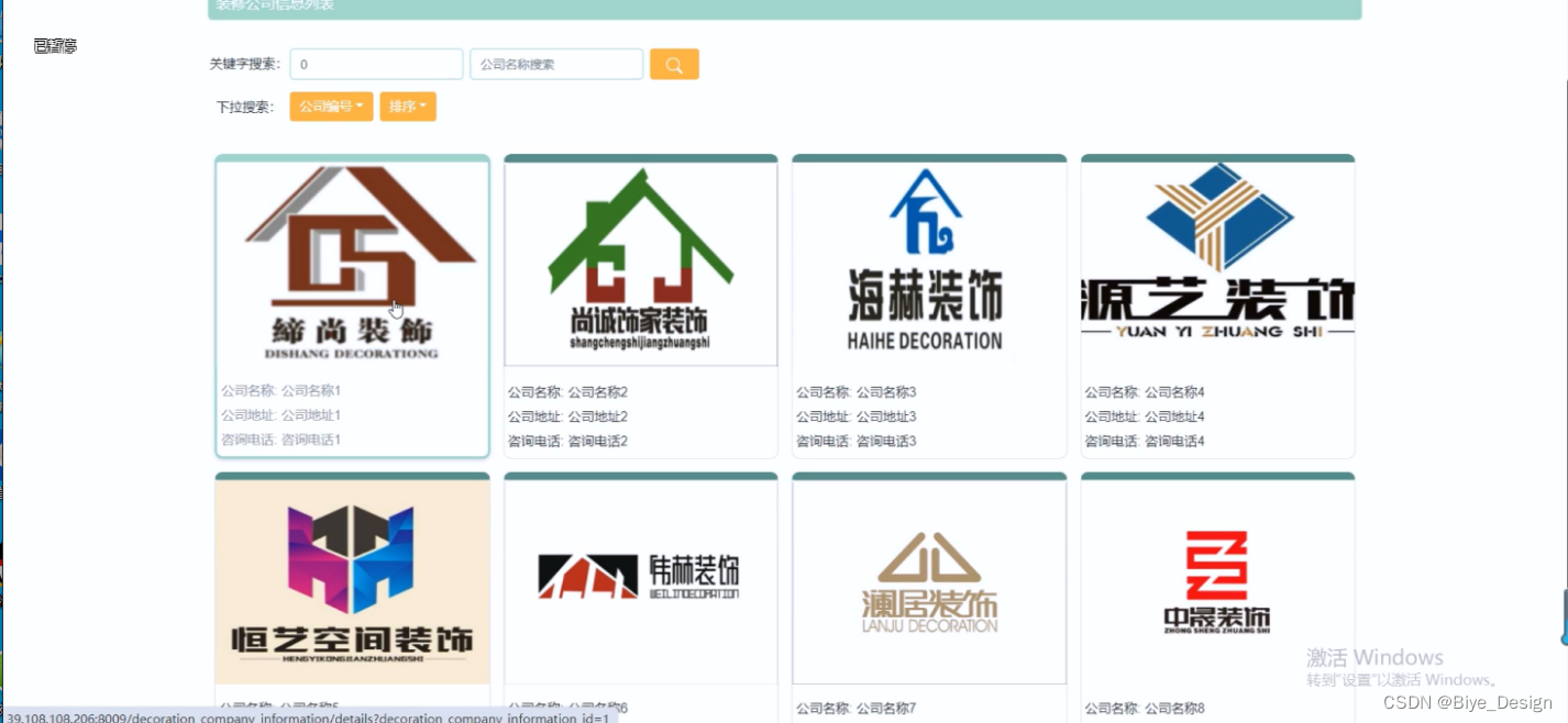 (4)装修公司信息:在首页导航栏上点击“装修公司信息”弹跳出的是装修公司信息列表,可以点击随意一款装修公司进行了解其具体信息。包括公司名称、公司地址、咨询电话、公司编号等;