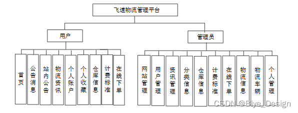 物流管理平台整体的功能模块包括管理员+注册用户两个模块,实现了对物流相关信息的查询管理,系统功能模块如图所示。
