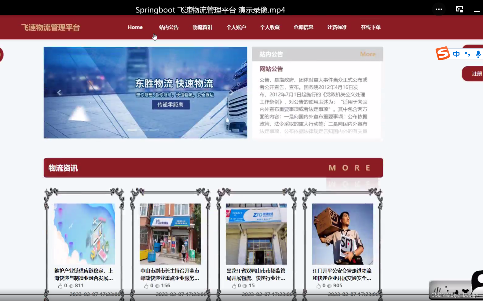 (1)首页信息:当用户进入本物流管理平台的前台的时候,首先展示在眼前的是导航栏、轮播图、公告栏等信息,用户可以根据自己个人的需求进行查看;