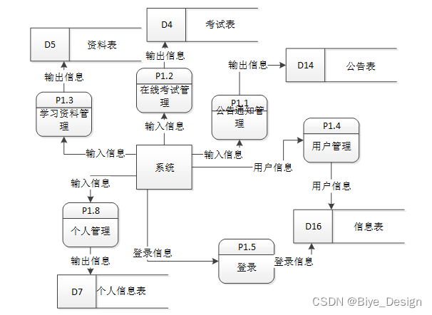 二层数据流程是对一层数据流层图中填写登录信息、用户功能的细化。即:填写登录信息细化为填制信息、首页、个人资料、在线考试、学习资料、学习情况等操作。